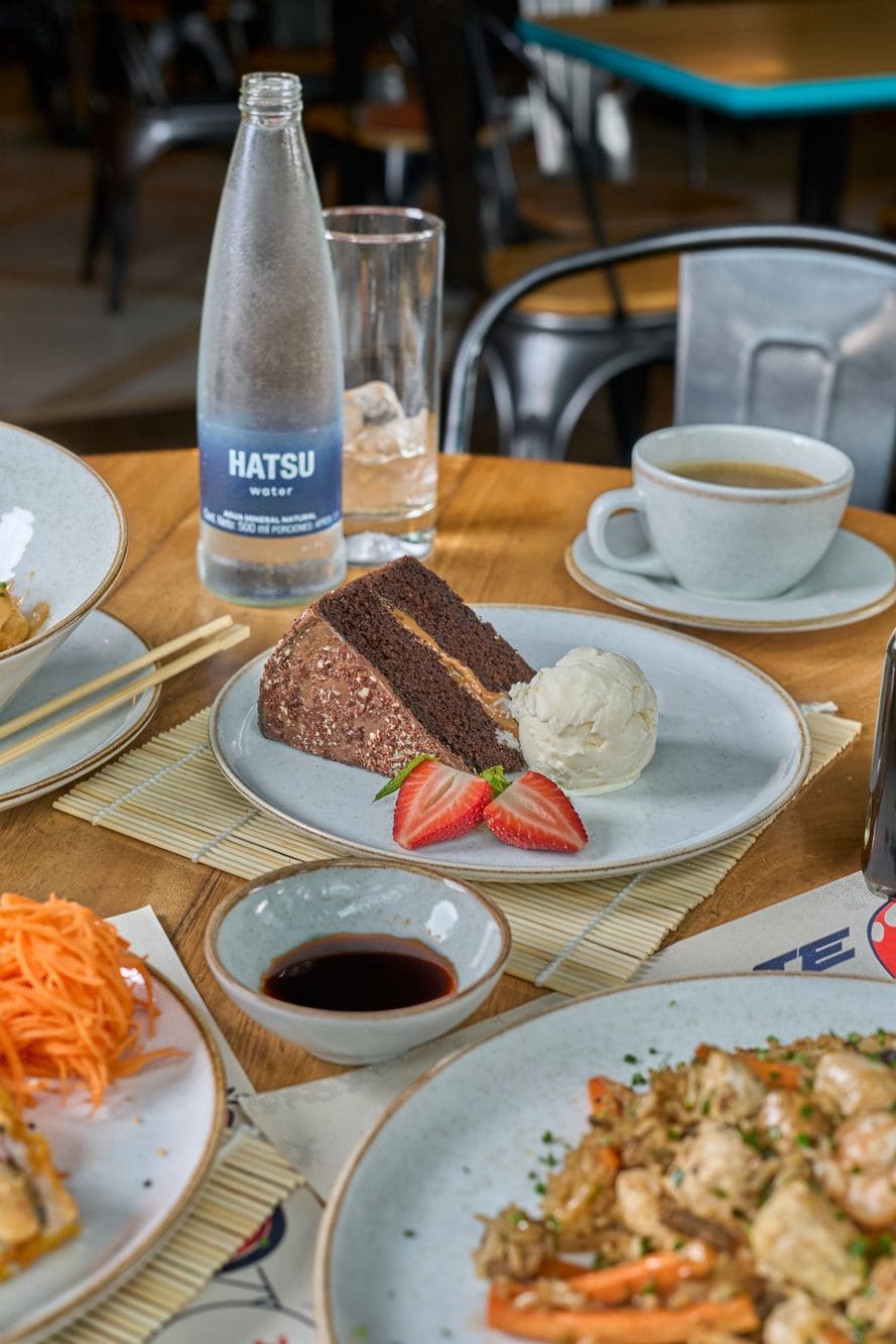 - Veggie roll: Roll relleno de aguacate, zanahoria y pepino; con tope de plátano maduro y puerro caramelizado.