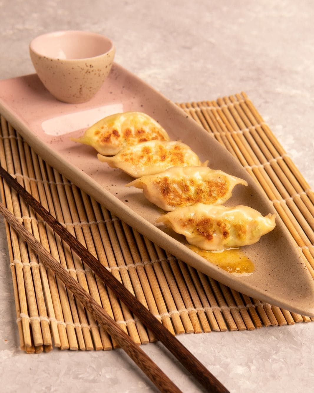 - Gyosas de cerdo: Empanaditas asiáticas al vapor, rellenas de cerdo y acompañadas con mermelada de ají amarillo y frutos rojos