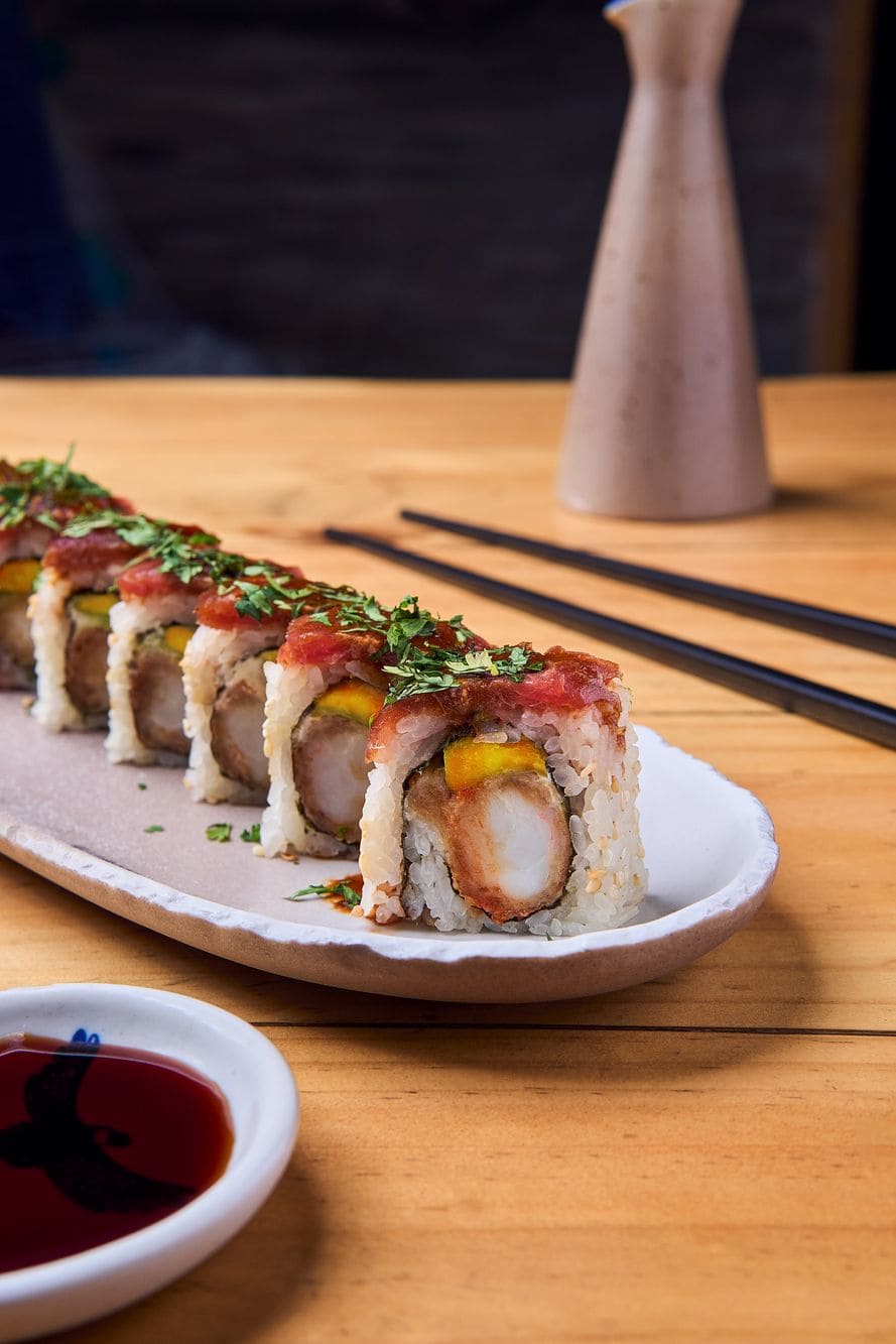 - Rollo Buenaventura: Rollo con langostino apanado, mango y queso crema, cubierto con atún del pacífico y bañado con ponzu de rocoto (levemente picante)