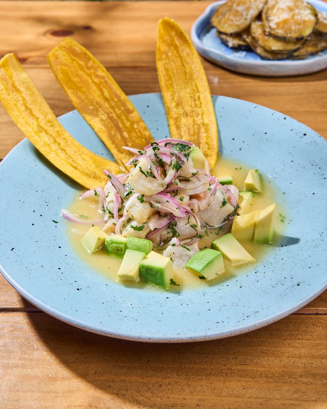 - Ceviche mixto: Ceviche con pescado y camarones en gulupa, acompañado con chips de plátano y aguacate