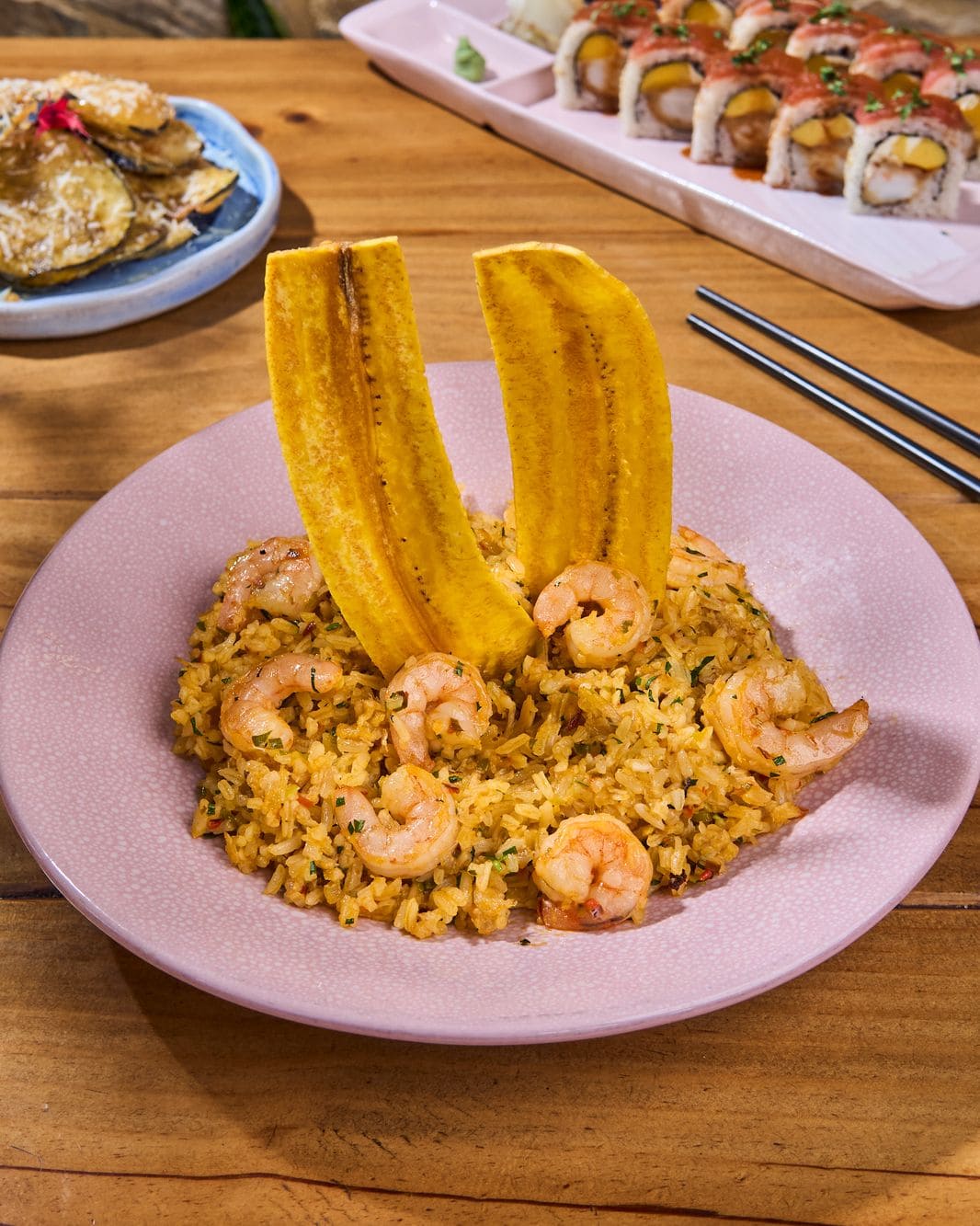- Arroz pacífico: Arroz cremoso en leche de coco, con hierbas de la azotea, jaiba y camarones