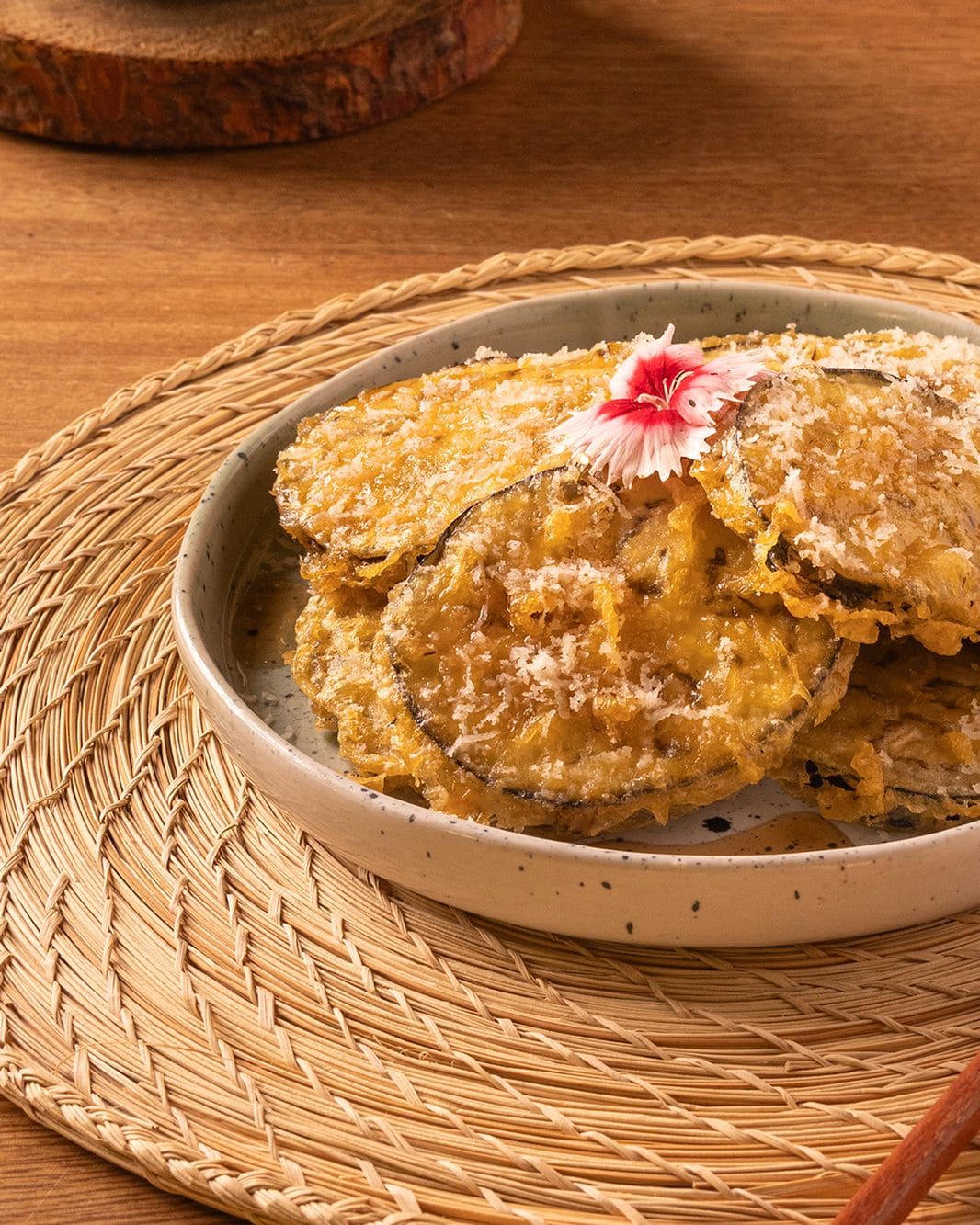 - Berenjenas tempura: Berenjenas tempura especiadas, bañadas con miel de jengibre y queso de cabra.