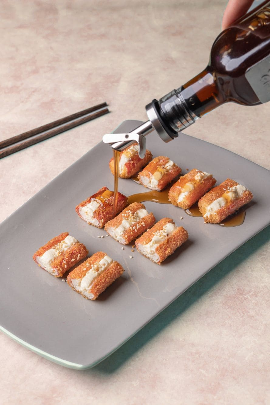 - Cream kani: Palmitos de cangrejo con queso crema, ajonjolí y miel de jengibre.