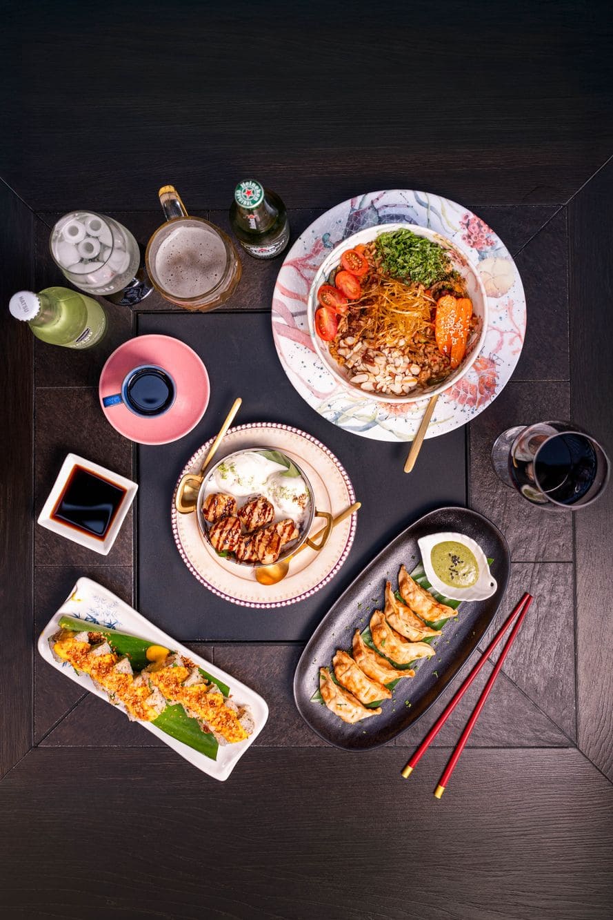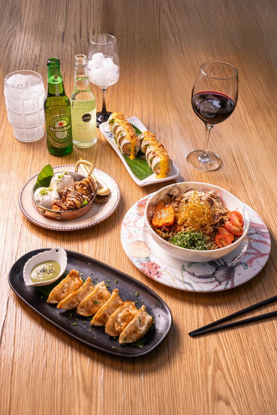 - Gyosas: Gyosas artesanales de cerdo y jengibre, elaboradas con delicadeza y acompañadas de una salsa de albahaca fresca que aporta equilibrio y profundidad aromática.