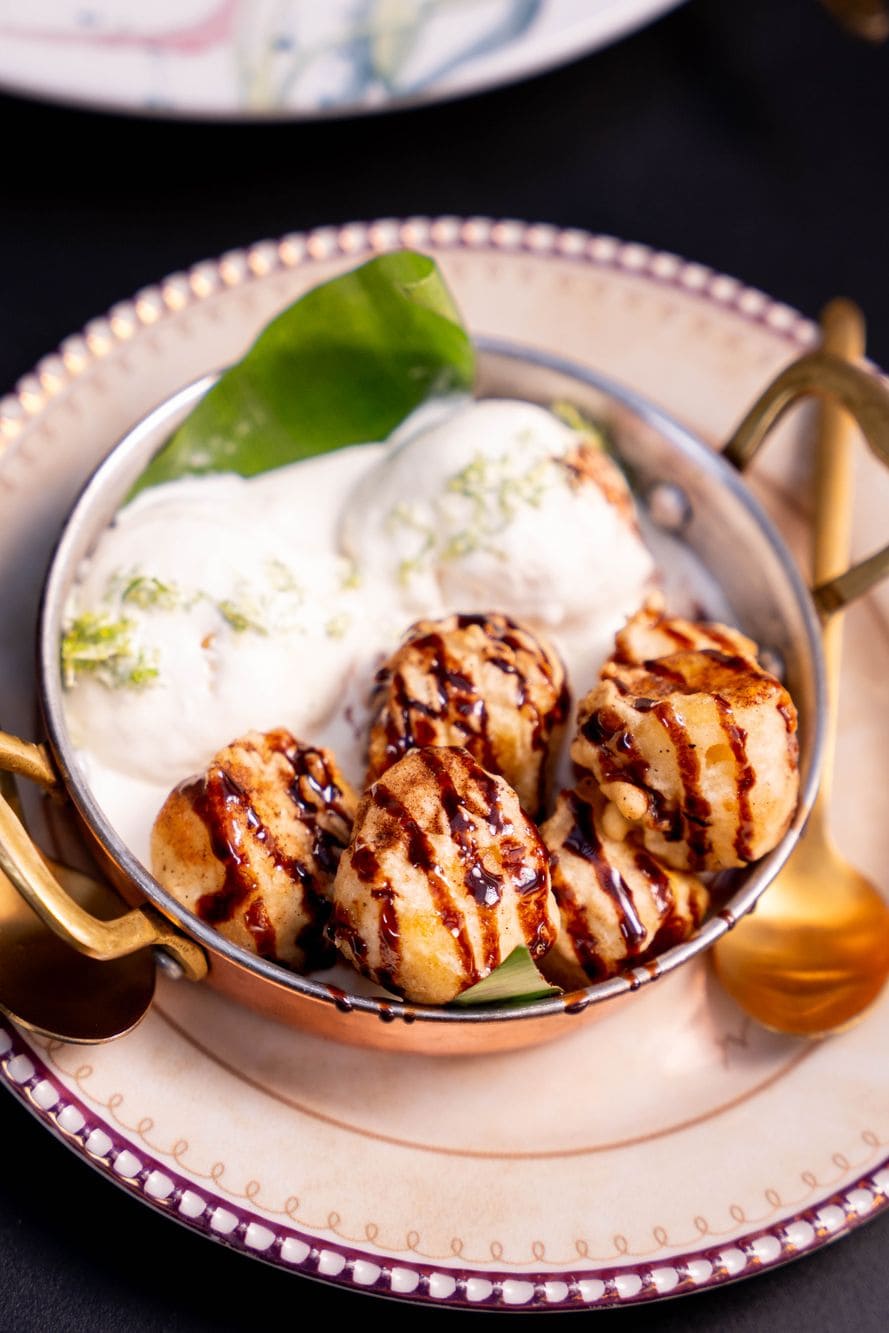 - Banana tempura crocante: Banana tempurizada de textura delicadamente crocante, acompañada de helado de vainilla para un contraste armonioso entre temperatura y suavidad.
