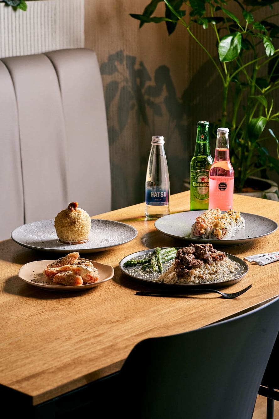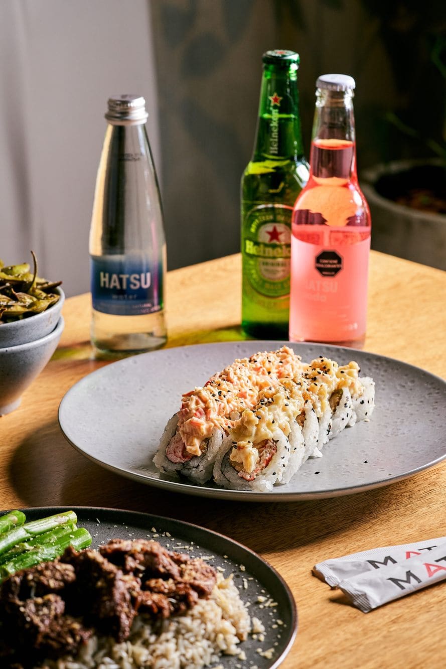 - Conde roll: Rollo con langostino tempura, palmito, queso crema y aguacate, medio rollo con topping de kanikama en siracha mayo y medio rollo con picadillo de camarón tempura en salsa tibetano.
