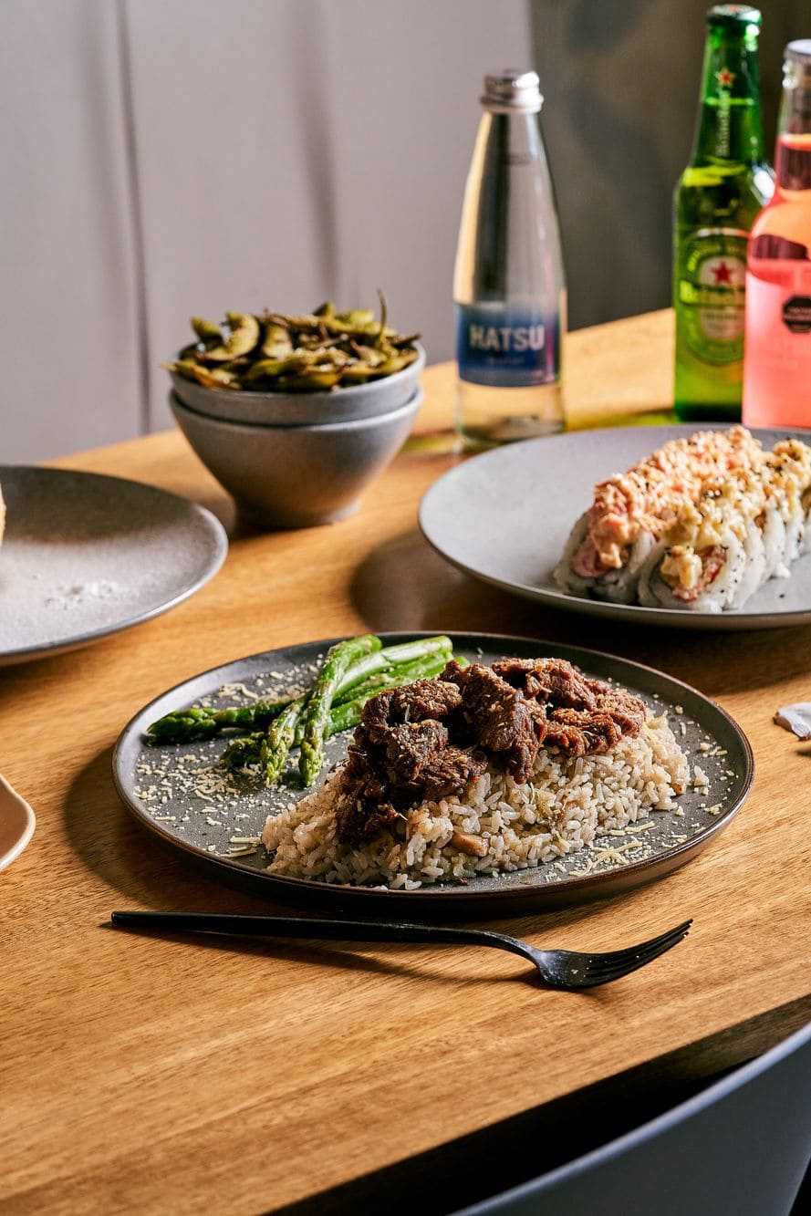 - Arroz cremoso de solomito y champiñones: 140 gramos de solomito fino en salsa camboya sobre una cama de arroz cremoso con champiñones, acompañado de espárragos al parmesano.