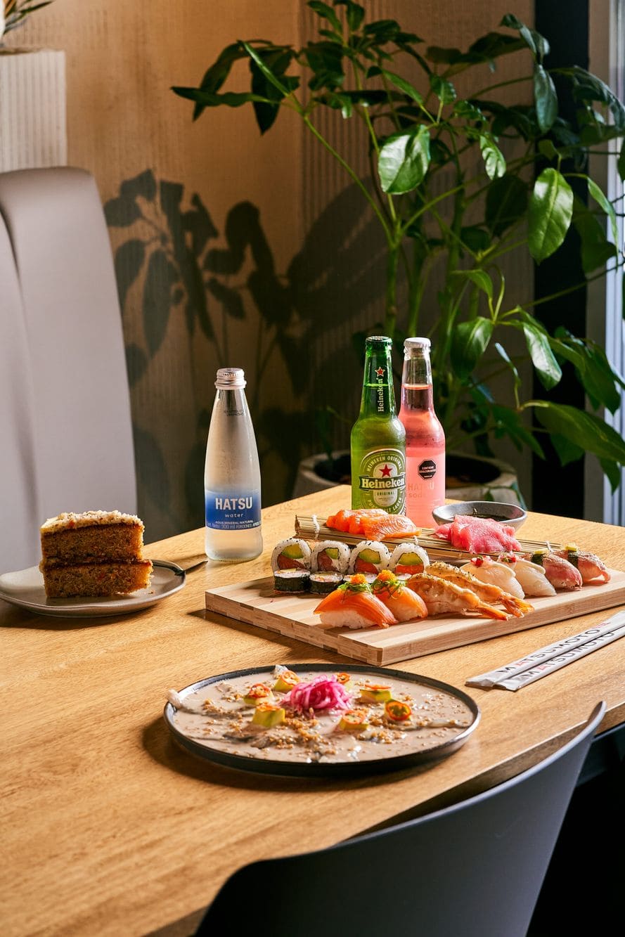 -Tabla Osaka: Tabla para compartir, compuesta por 60g de sashimi de salmón fresco, 60g de sashimi de atún del pacifico, 2 nigiris de tilapia fresca con topping de salsa acevichada y picadillo, 2 nigiris de atún del pacifico flameado con topping de mango y ajonjolí, 2 nigiris de langostino flameados en salsa parmesana y 2 nigiris de salmón fresco con topping de wakame, 8 bocados de sushi elegidos a gusto del chef, acompañados con salsa ponzu