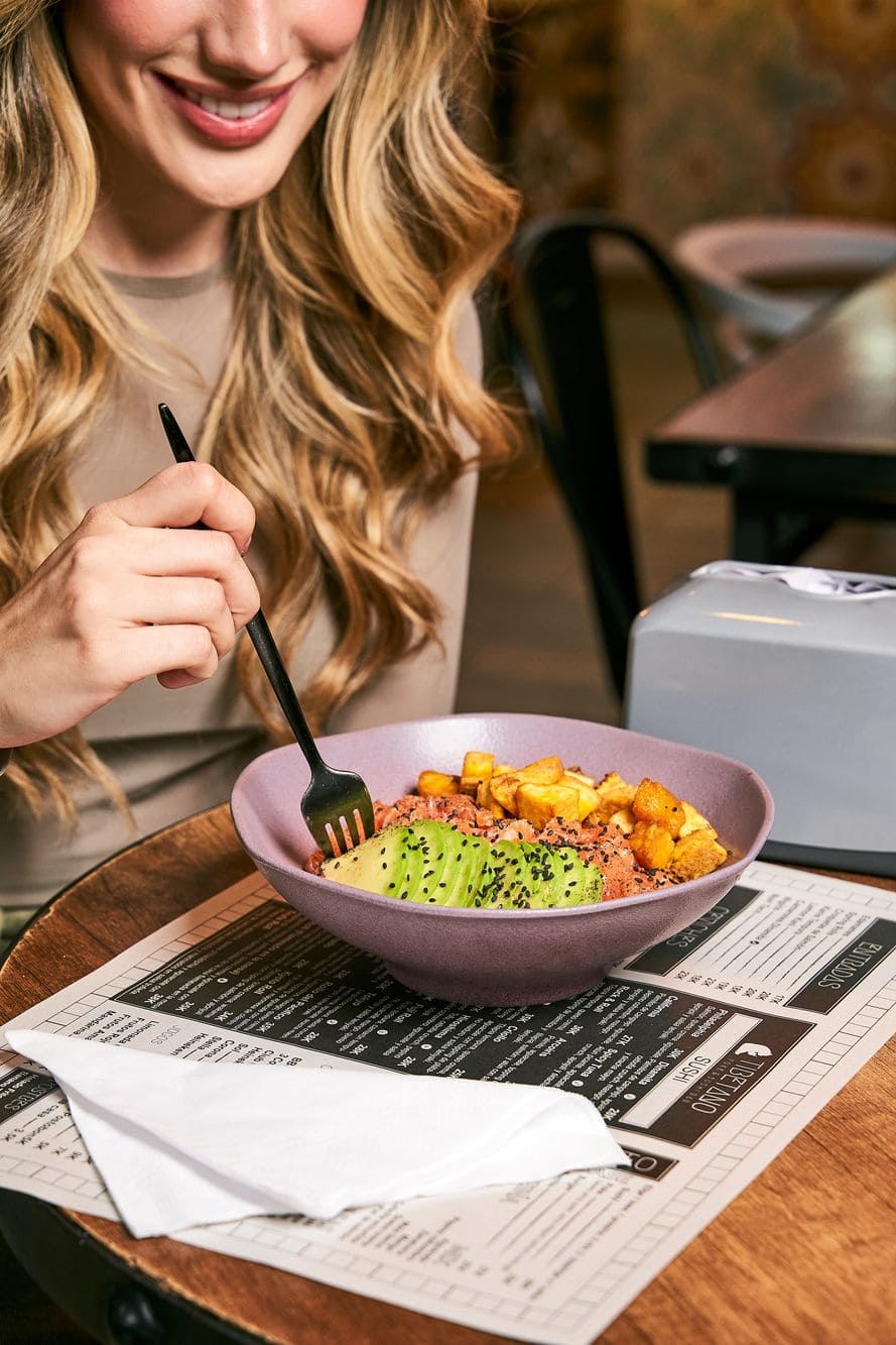 - Tiradito de pesca blanca: Tiradito de tilapia fresca bañada en salsa acevichada, acompañado de aguacate flameado, ají dulce y cebolla encurtida, coronado con quinoa crocante.