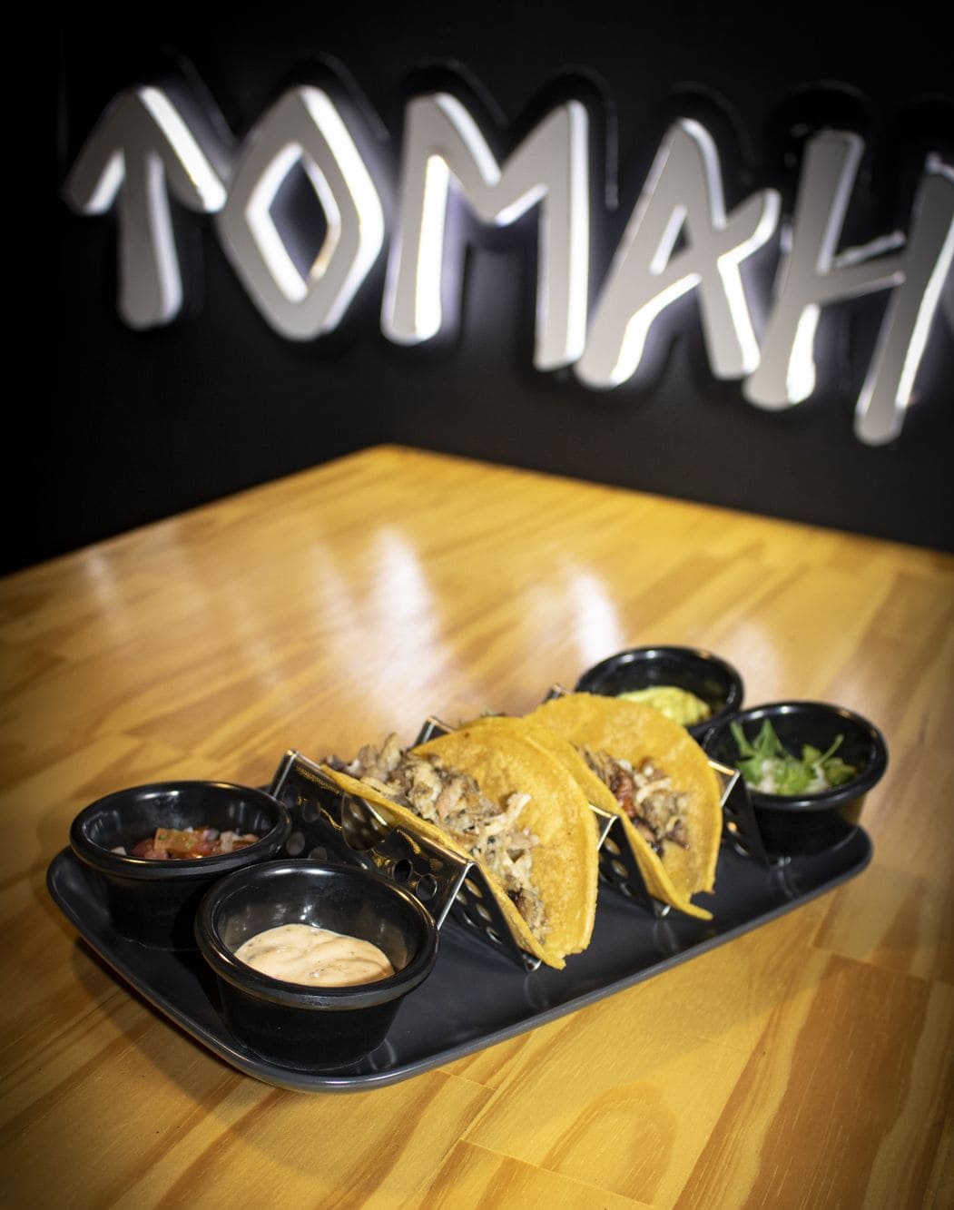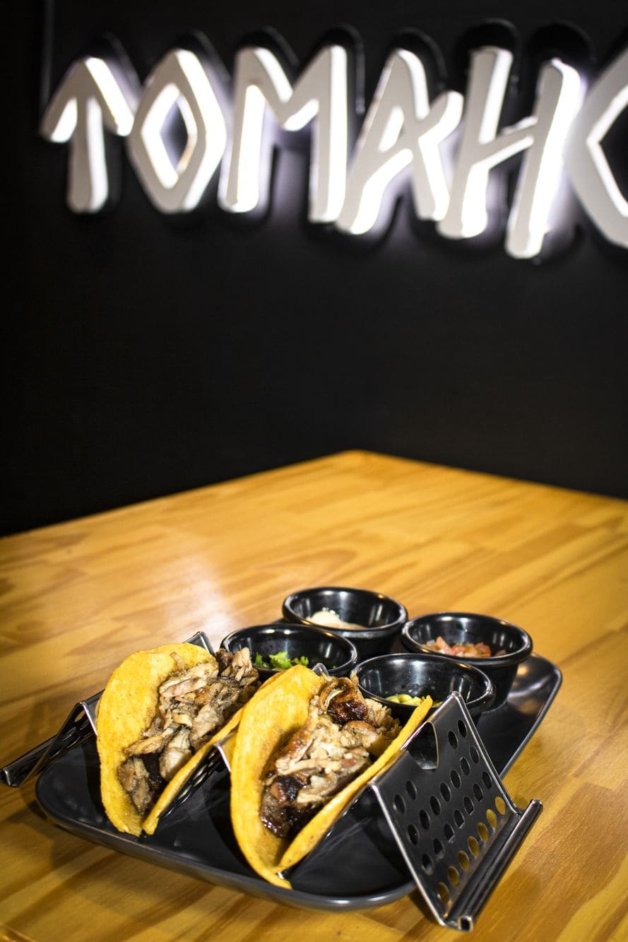 - Tacos ahumados: Tacos ahumados de tortilla de maíz, pork belly chopped, guacamole, pico de gallo y cebolla con cilantro.