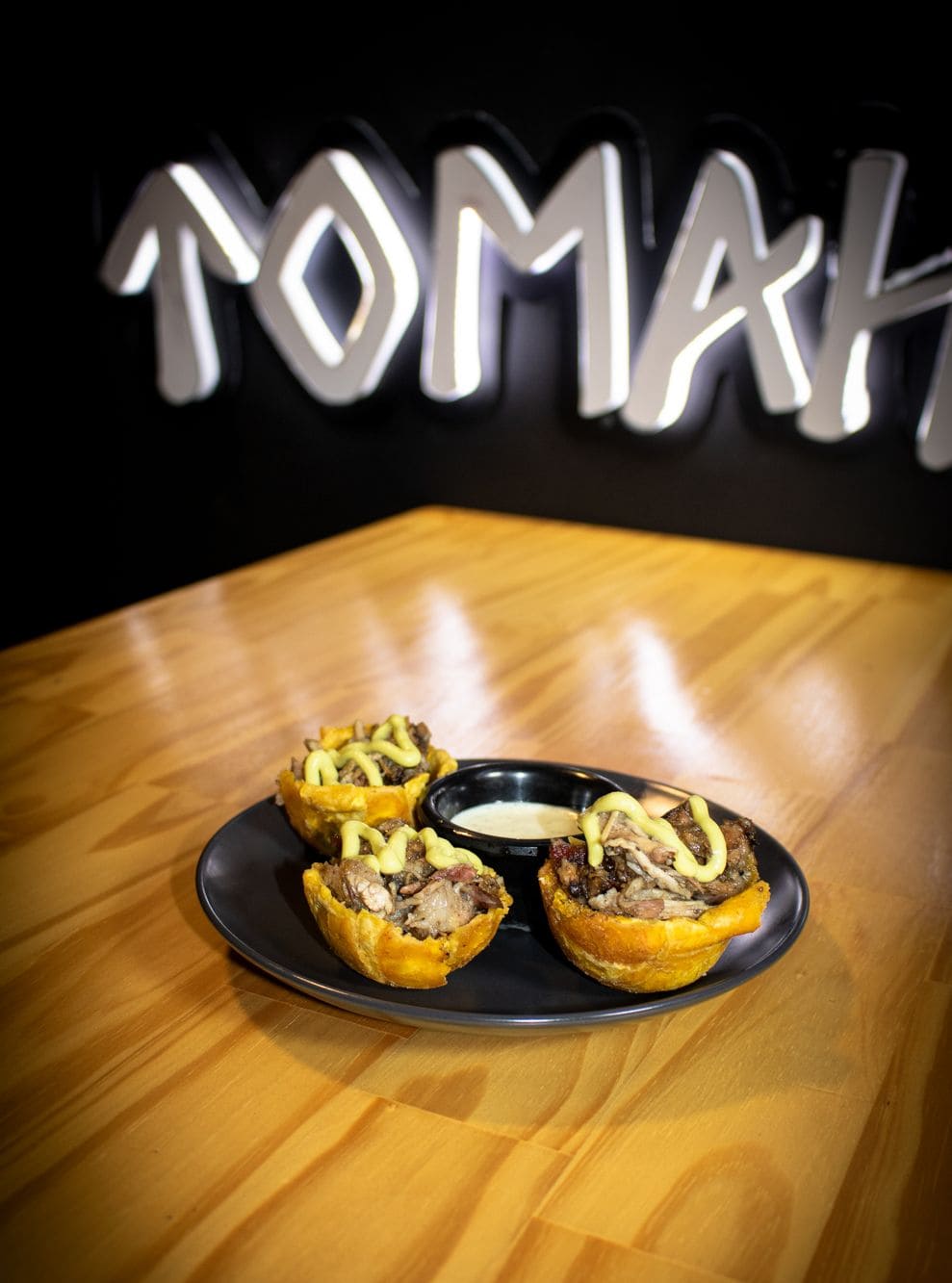 - 3 Tostones: Canastas de tostones ahumados relleno de guacamole pico de gallo y pork belly chopped con nuesto alioli de ajo