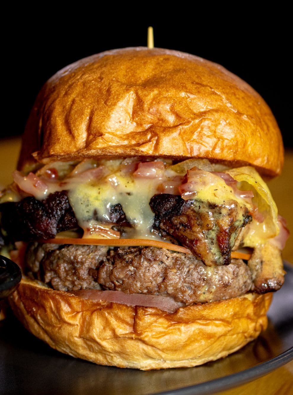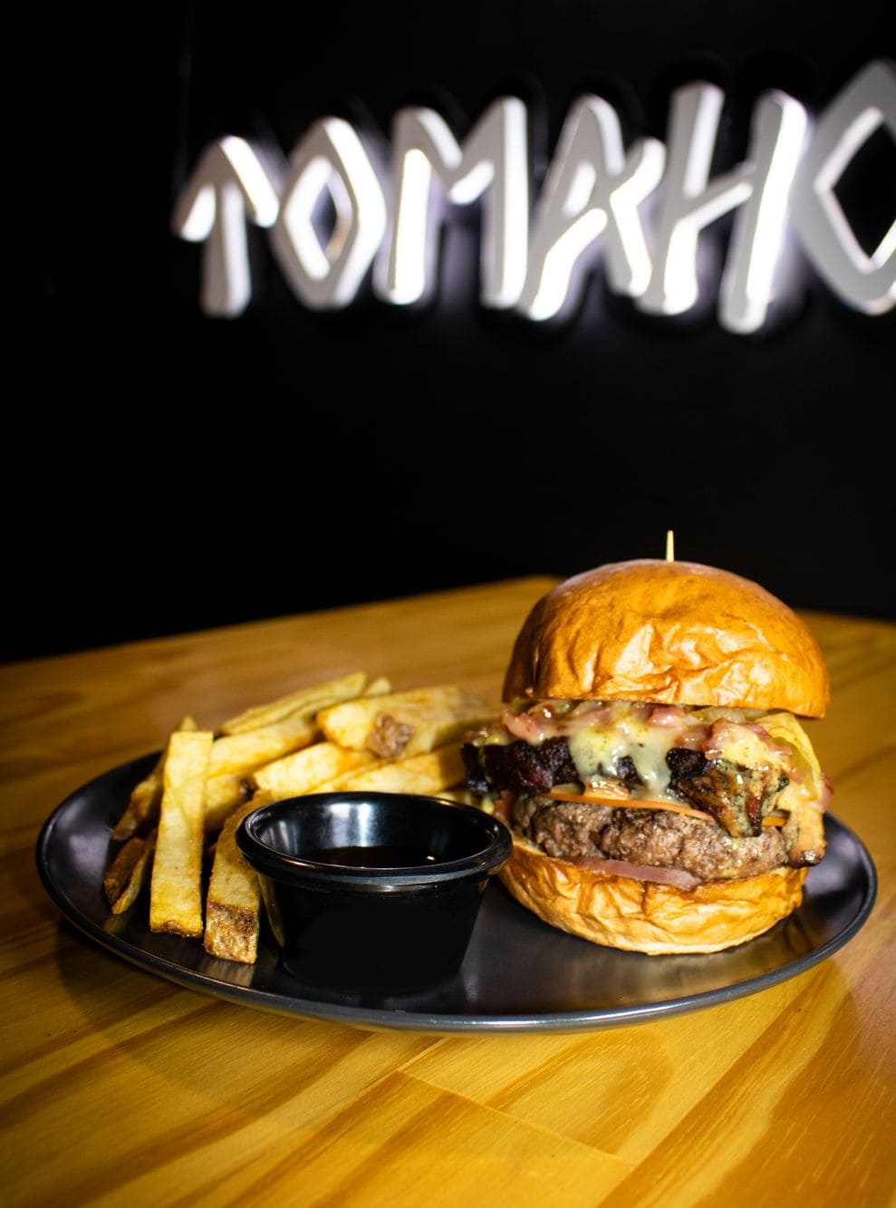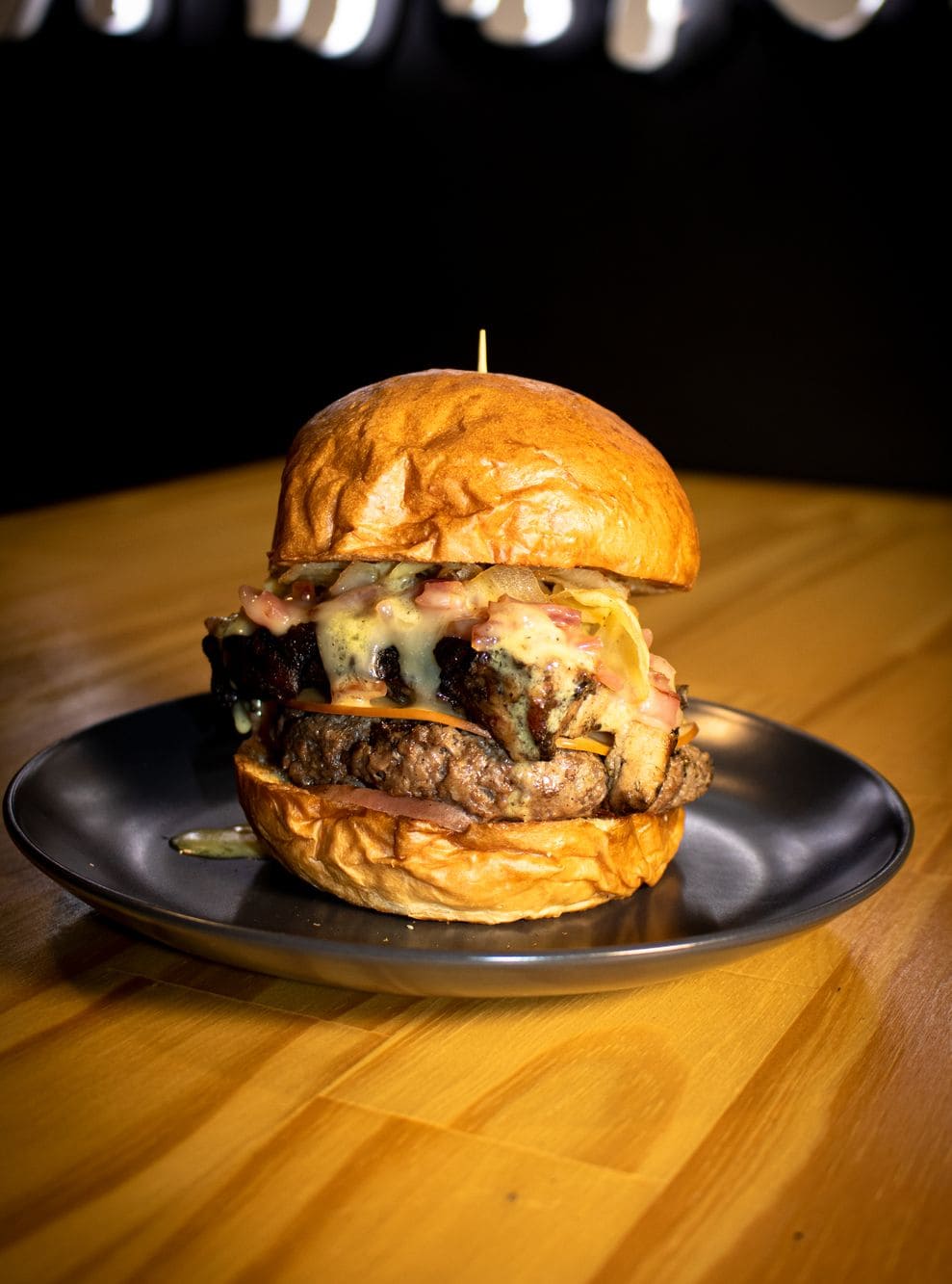 - Burger toffee: Una explosión de sabores entre dulce, saladado, acido, viene con mayonesa de maracuyá, salsa toffee de tocineta, chips de yuca, queso gouda ahumado, pork belly ahumado, carne de res brangus y encurtidos