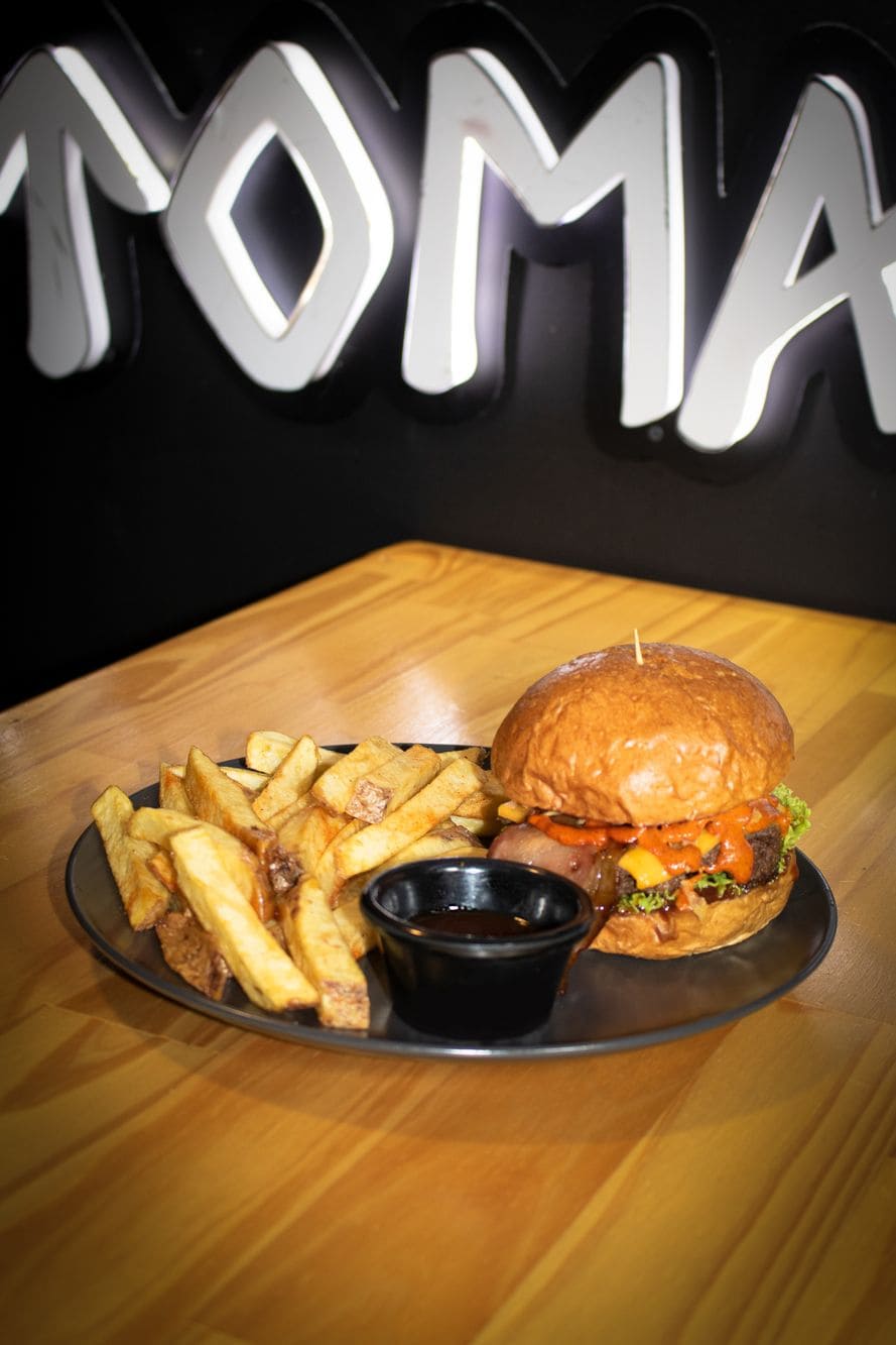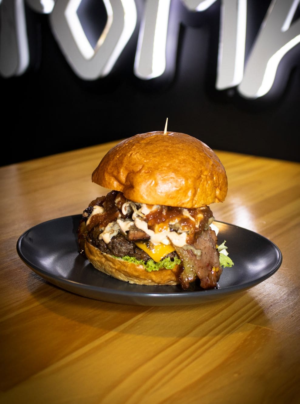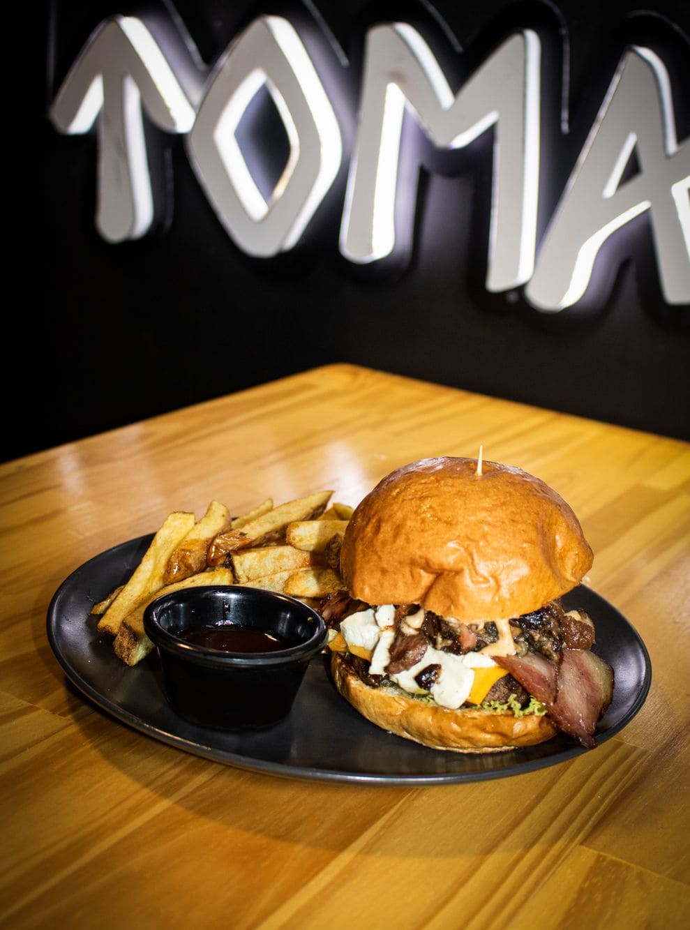 - Burger toffee: Una explosión de sabores entre dulce, saladado, acido, viene con mayonesa de maracuyá, salsa toffee de tocineta, chips de yuca, queso gouda ahumado, pork belly ahumado, carne de res brangus y encurtidos