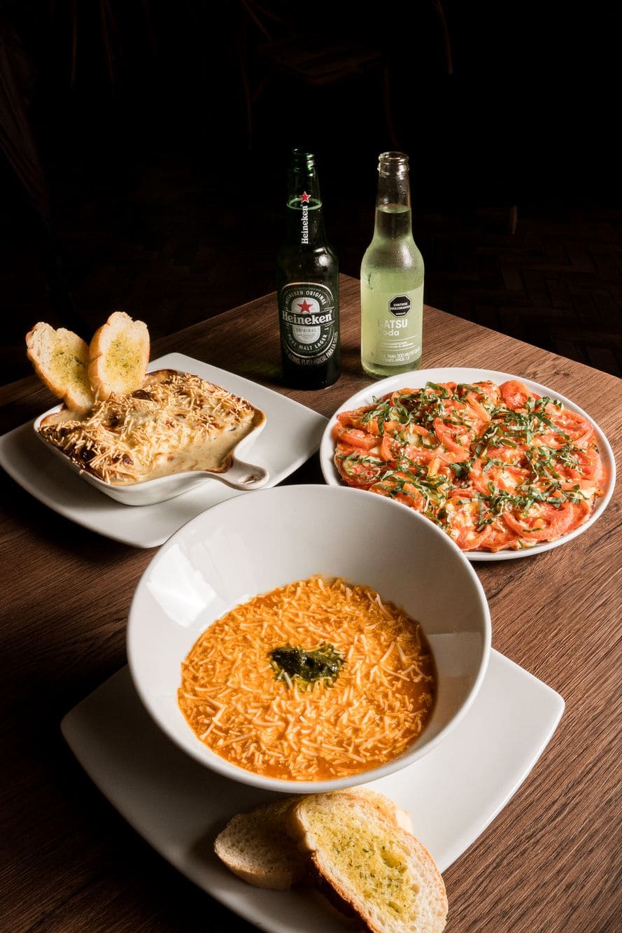 - Crema de tomate: 100% natural, gratinada con queso parmesano y un toque de pesto.