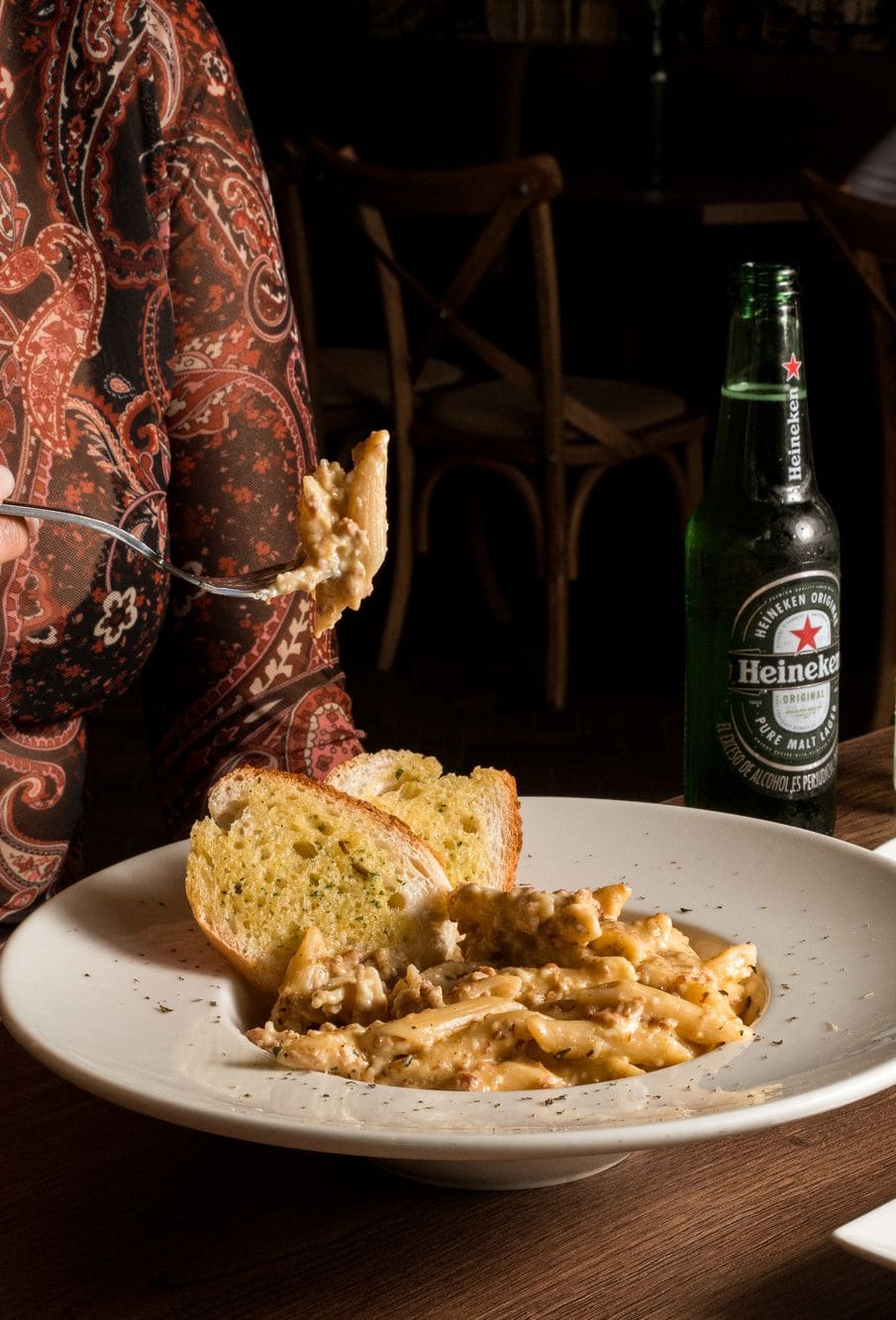 - Pasta carbonara: Pasta penne en salsa carbonara con tocineta, que crea una textura cremosa y un sabor intenso.