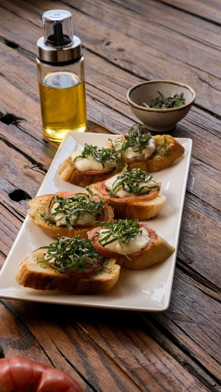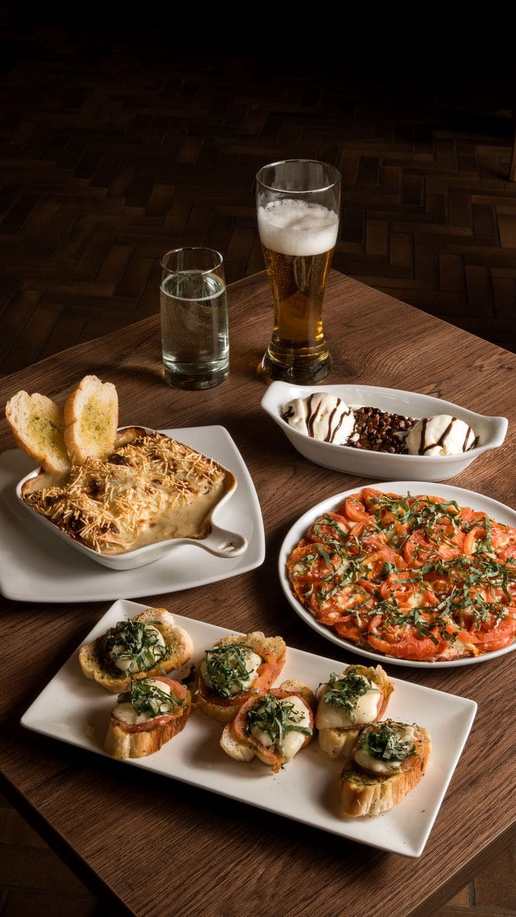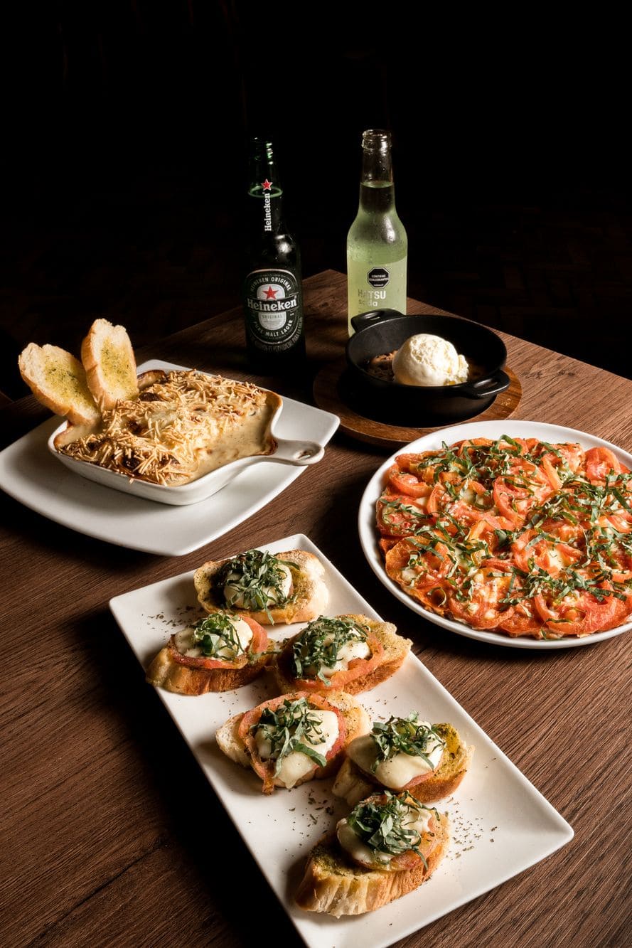 - Brushettas: 6 porciones de pan baguette con pesto, tomate, queso y albahaca.