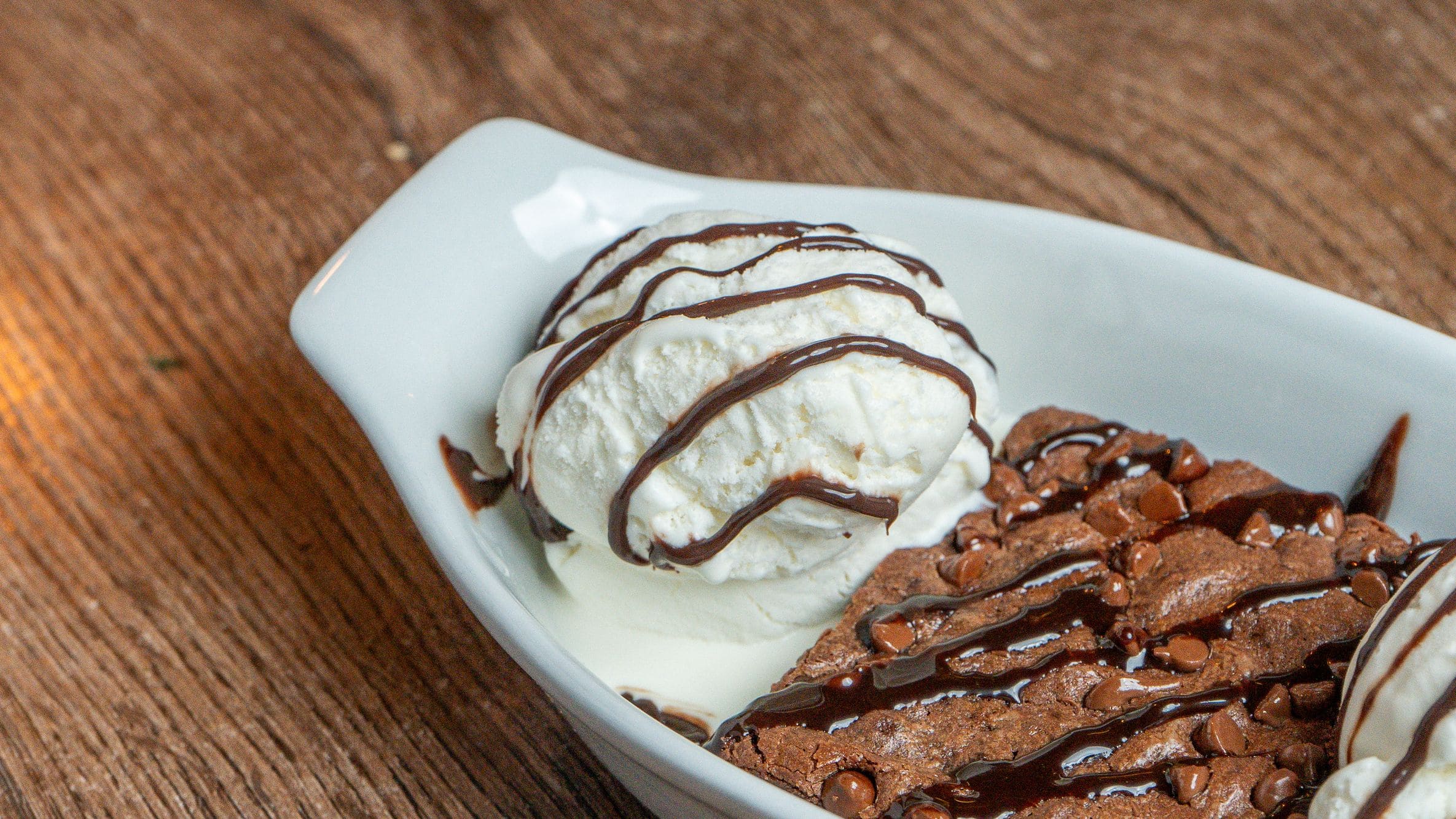 - Brownie con helado: Brownie caliente hecho en casa, servido con helado de vainilla y salsa de chocolate.