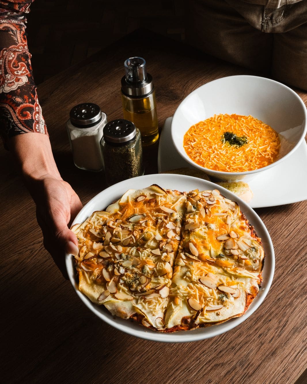 - Pizza personal 4 quesos con manzana y almendras (18 a 20cm diámetro): Queso mozarella, queso azul, queso parmesano, queso cheddar, manzana verde en laminas ligeramente caramelizada y almendras.