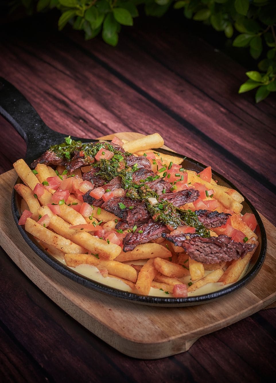 - Papas bariloche: Papas a la francesa sobre sour cream, con jugosa carne de res, pico de gallo y chimichurri.