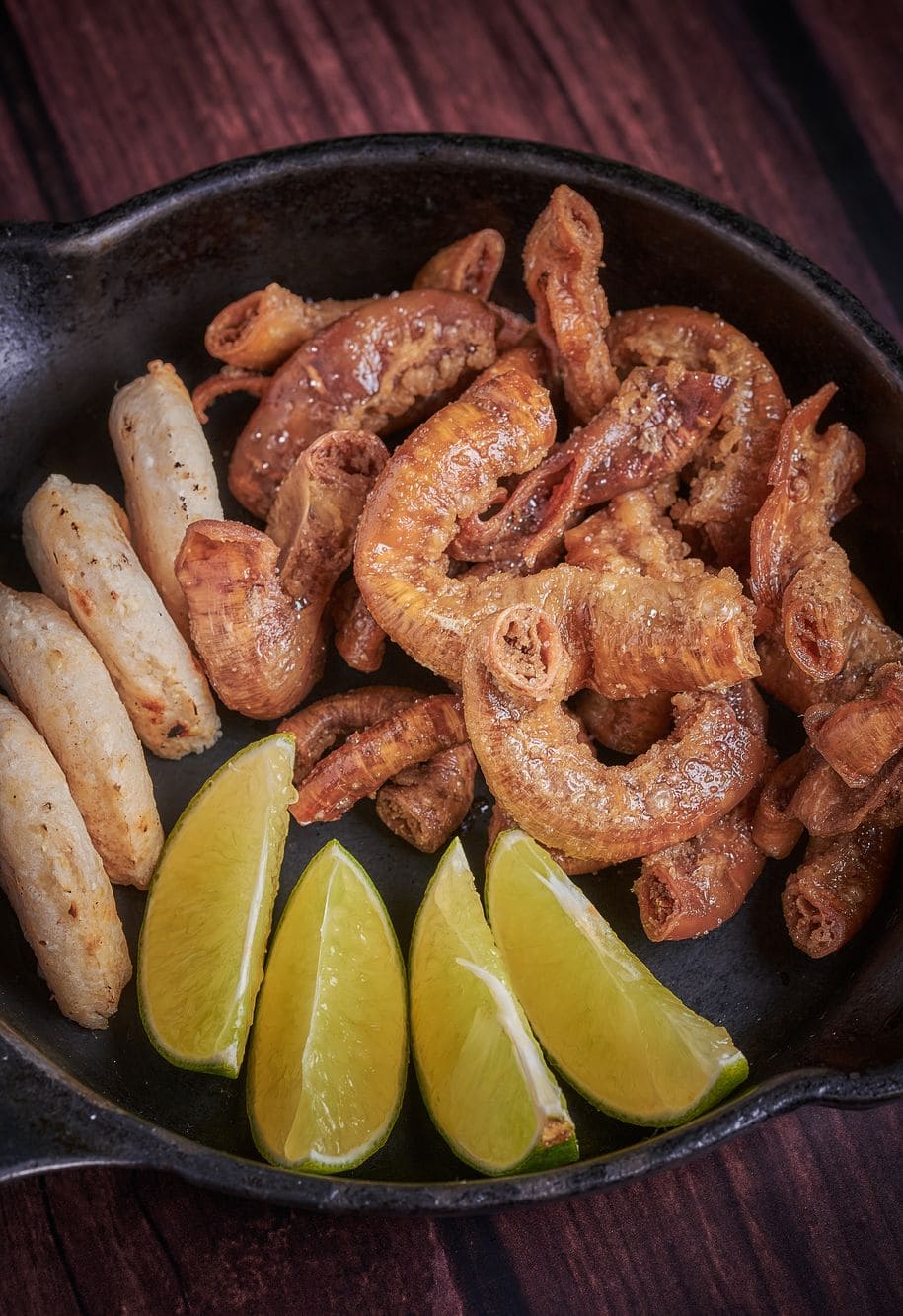 - Chinchulines a la parrilla: Bocados perfectamente cocidos y crujientes acompañados de limón y arepas.