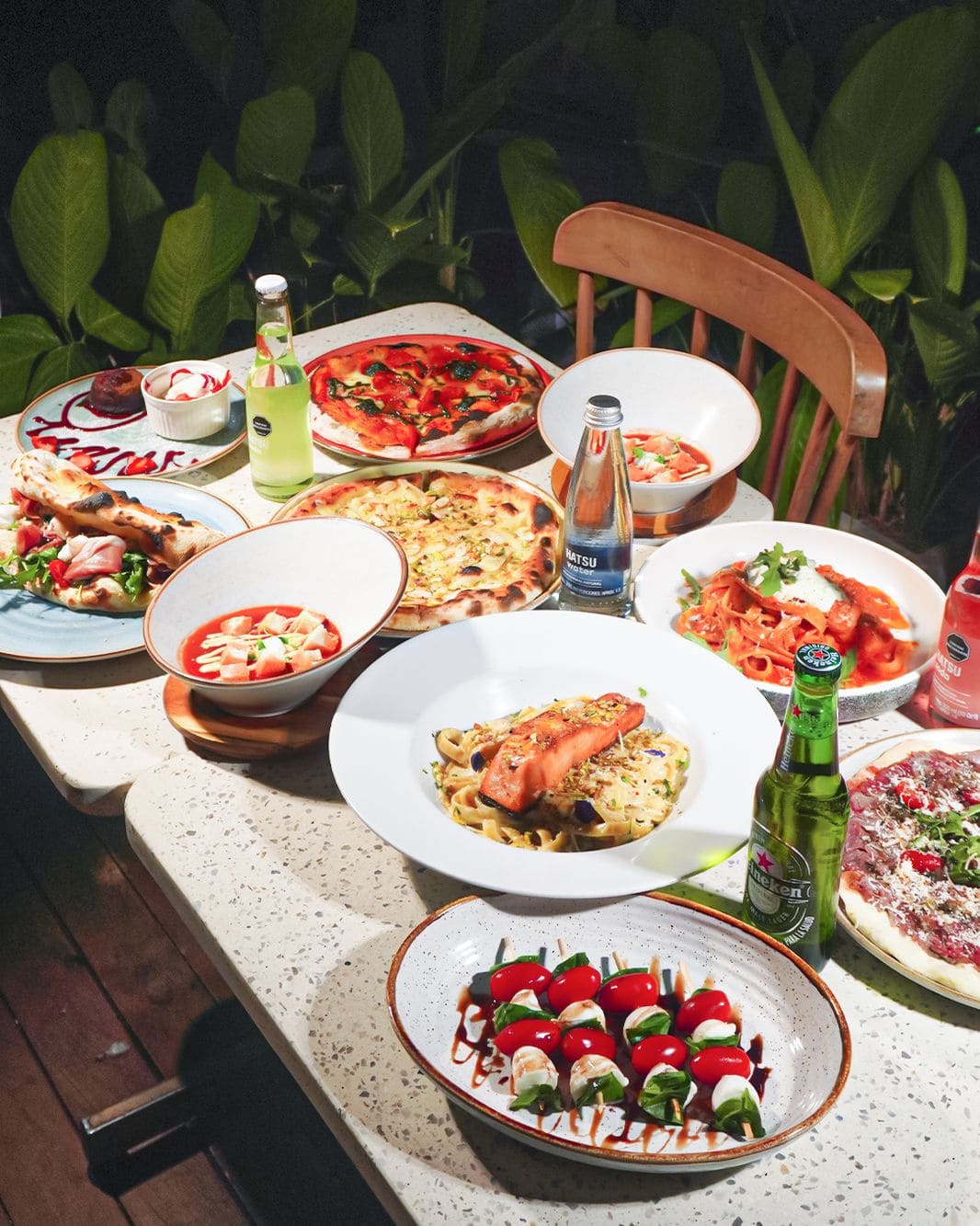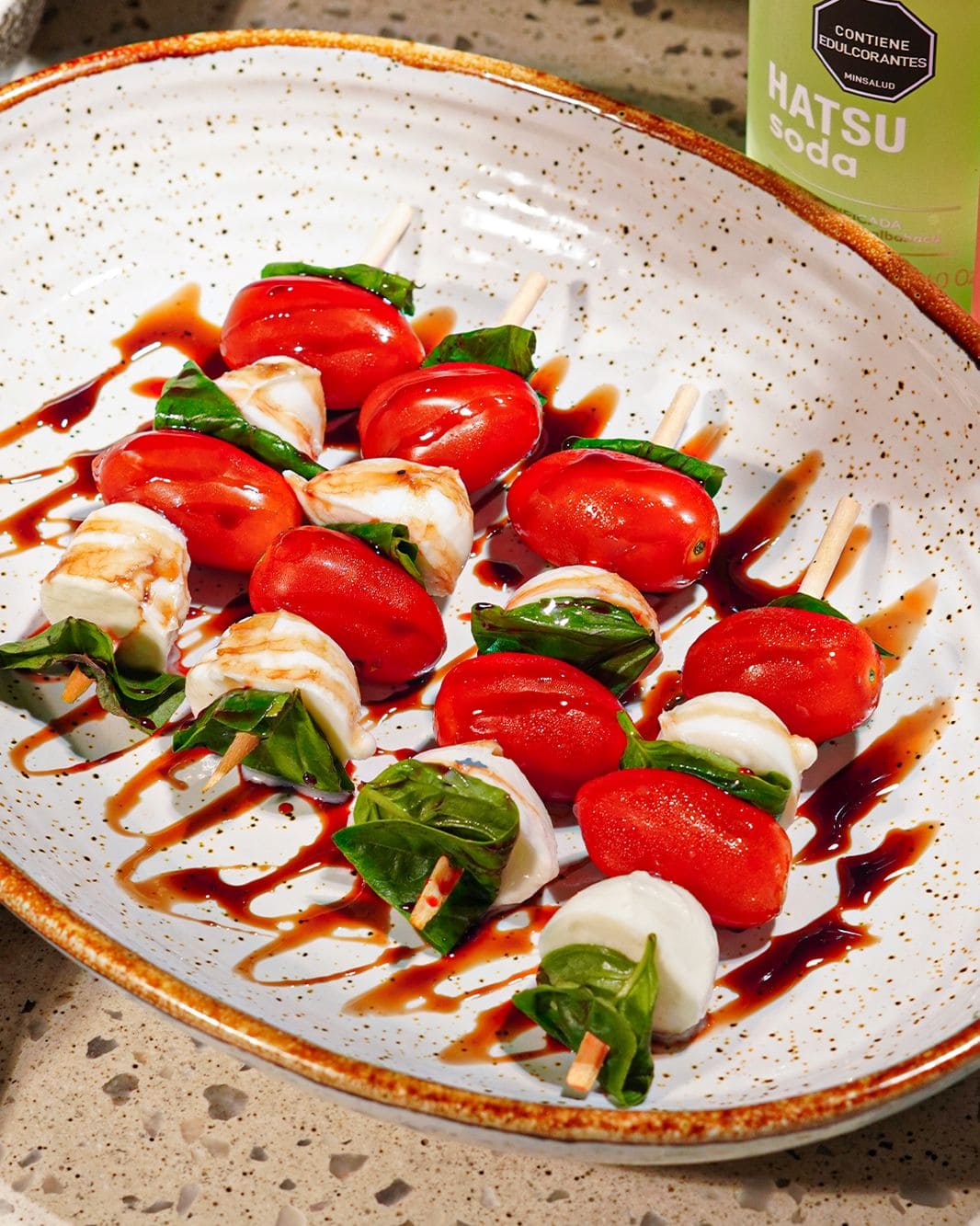 - Spiedini caprese (Brochetas caprese): Brochetas de tomate cherry, mozzarella fresca y albahaca, terminadas con reducción de balsámico y aceite de oliva.