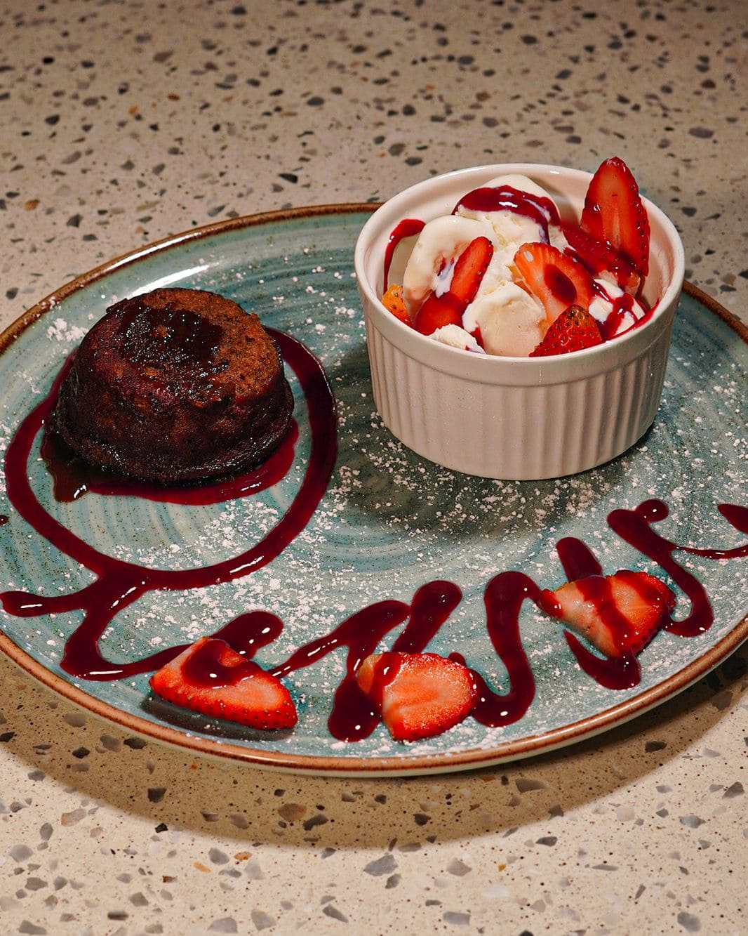 - Volcán de chocolate: Bizcocho tibio de chocolate con centro fundente, servido con helado artesanal de vainilla