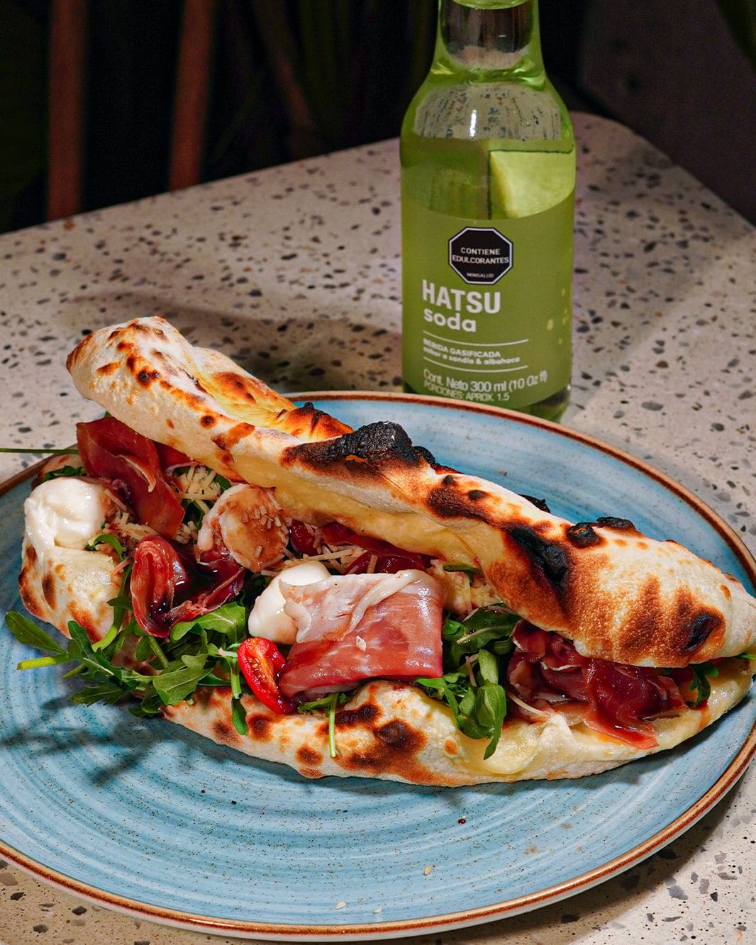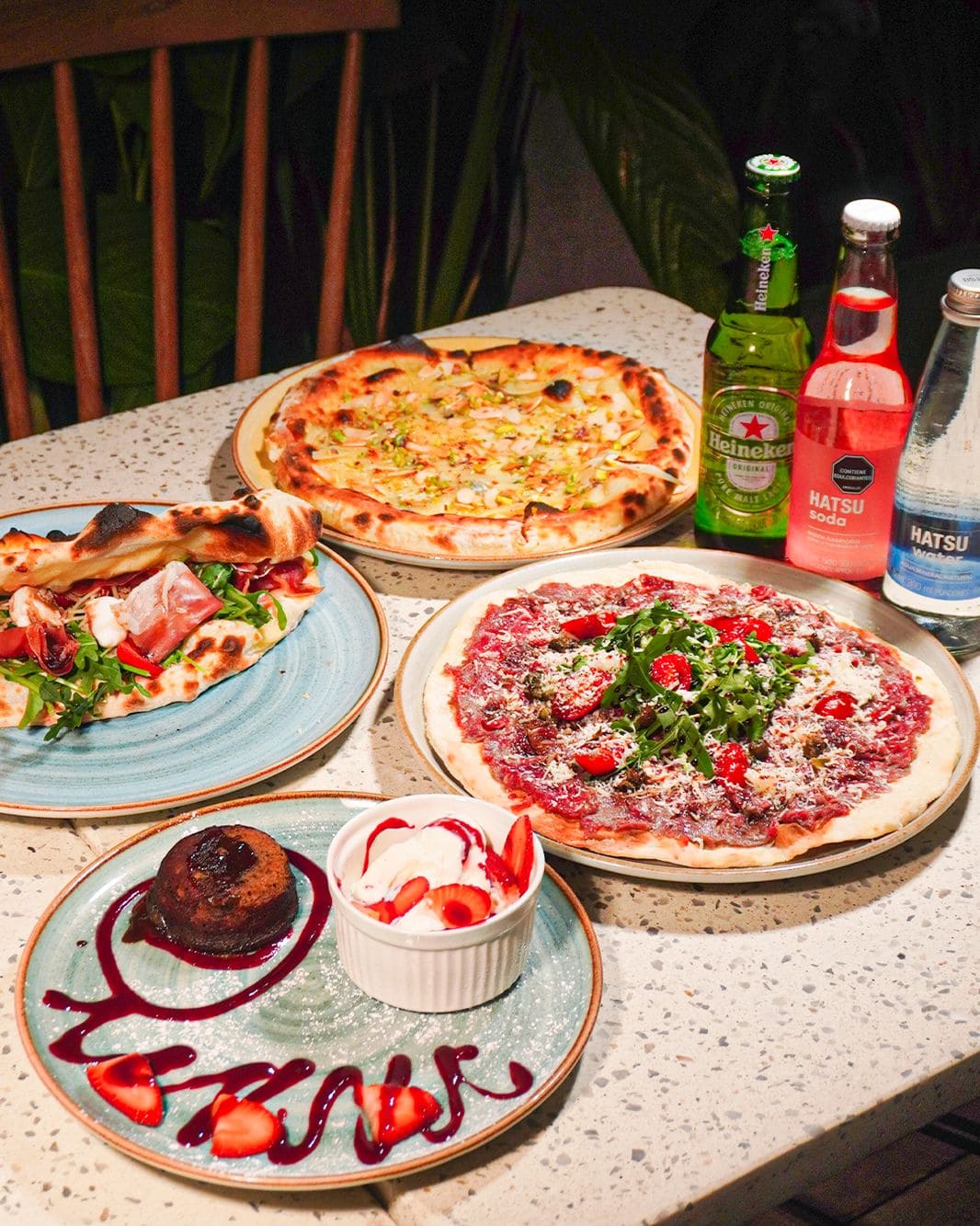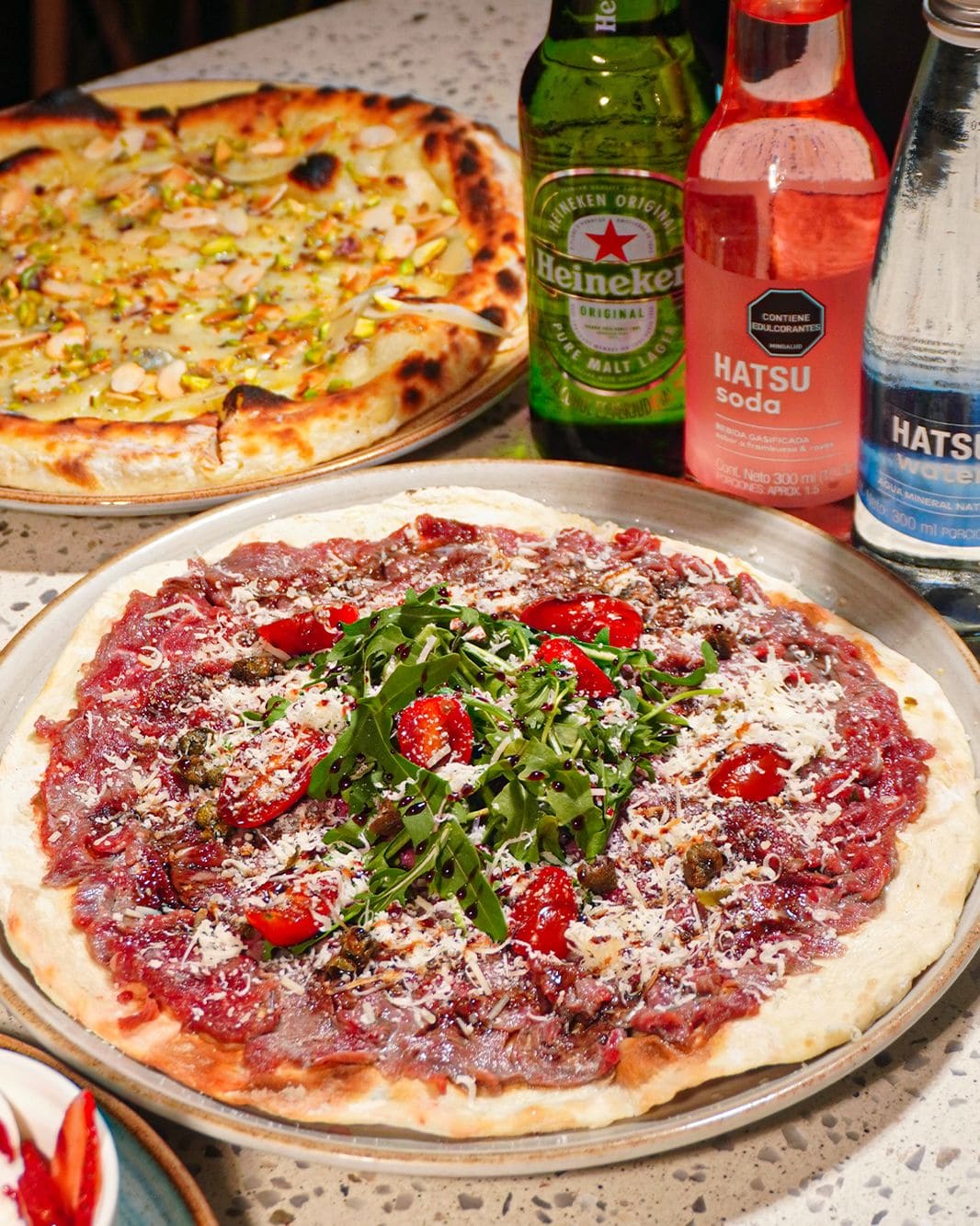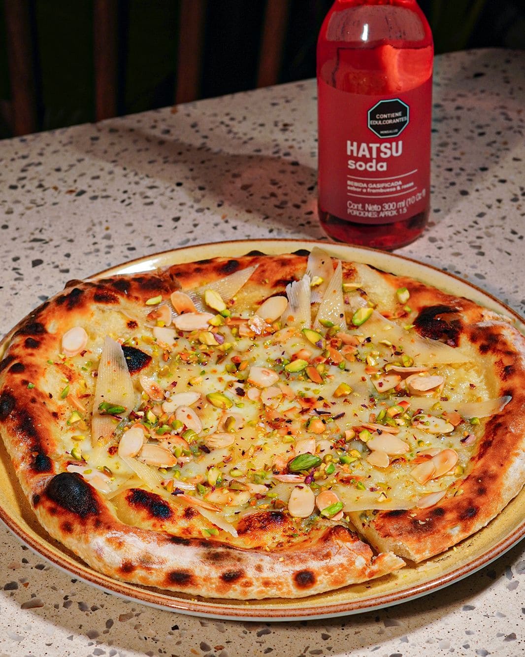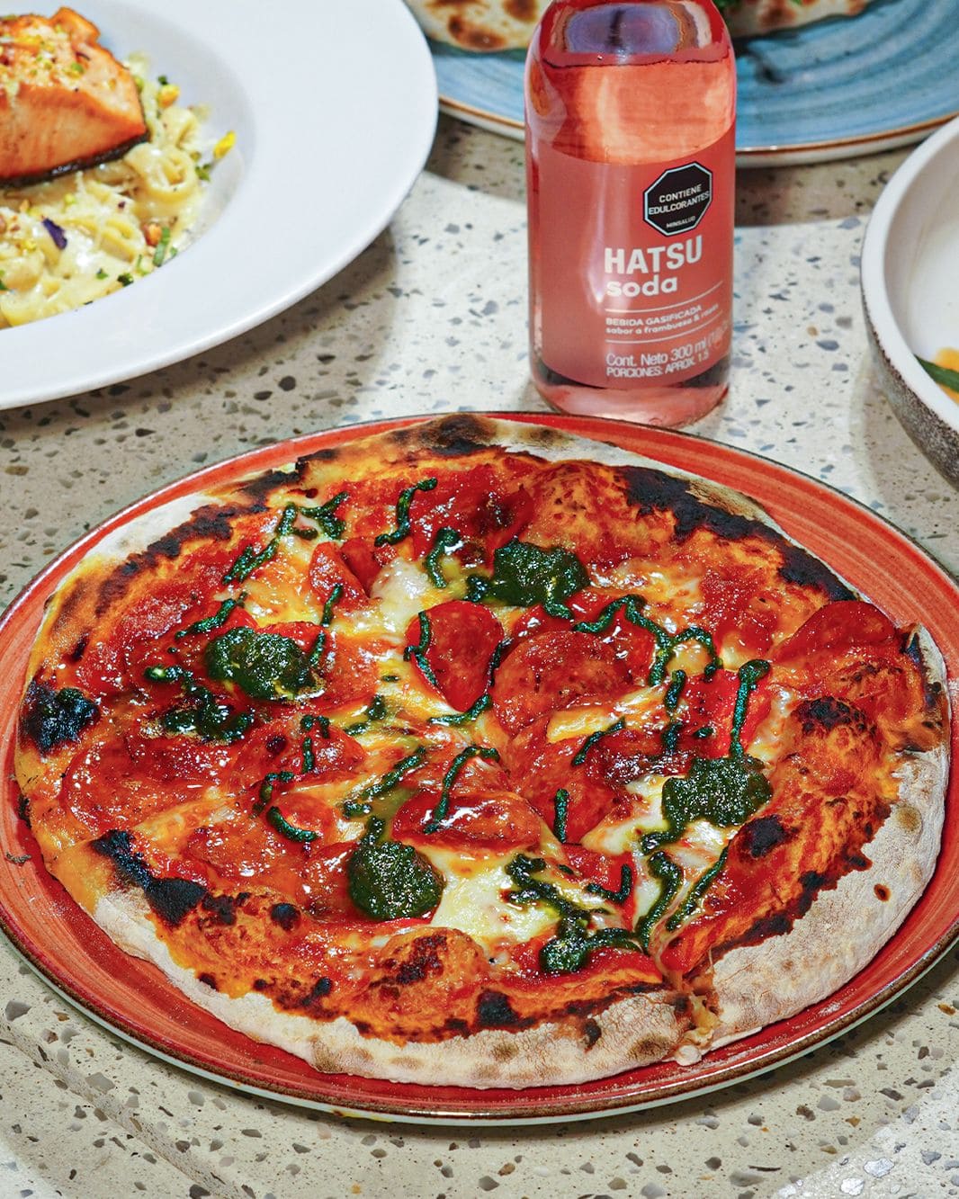 - Pizza dolce piccante: Base de pomodoro y mozzarella, pepperoni, pesto fresco con un toque de queso azul y un toque de miel que equilibra sabores intensos con un contraste dulce irresistible.