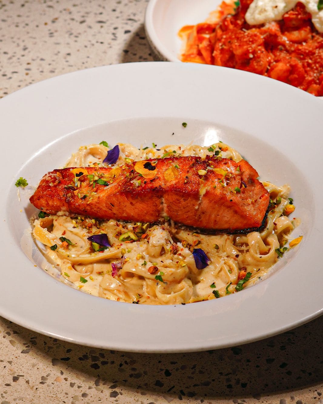 - Fettuccine al salmone e pistacchio: Pasta artesanal en salsa cremosa de queso, con salmón salteado, terminado con pistachos crocantes y aceite de oliva extra virgen.