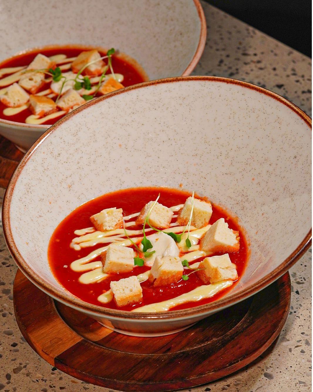 - Crema di pomodoro: Suave crema de tomate rostizado, con notas de albahaca fresca, aceite de oliva extra virgen y toque de crema y crotones.