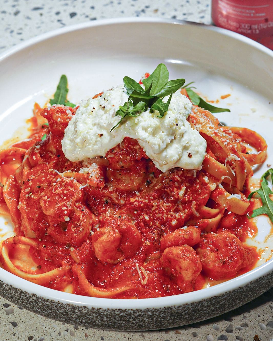 - Fettuccine gamberi e stracciatella: Pasta artesanal en salsa de pomodoro, acompañada de camarones salteados y coronada con stracciatella cremosa y aceite de oliva extra virgen.