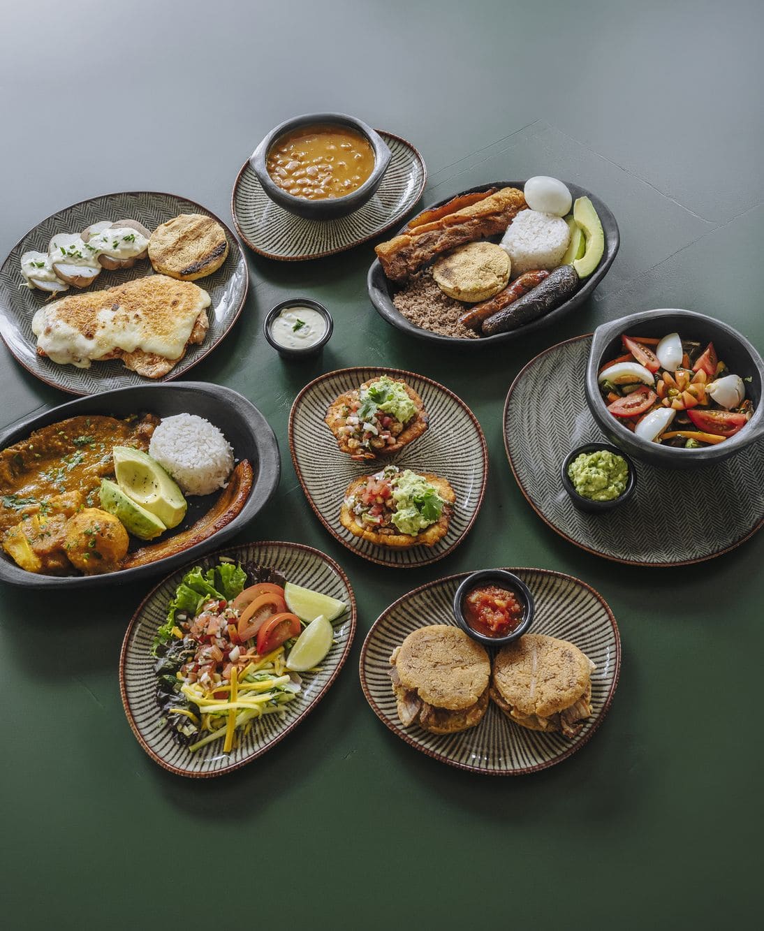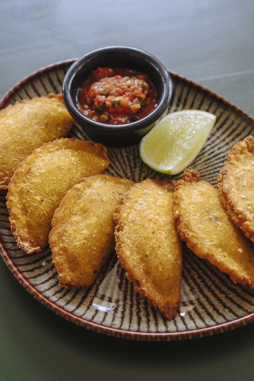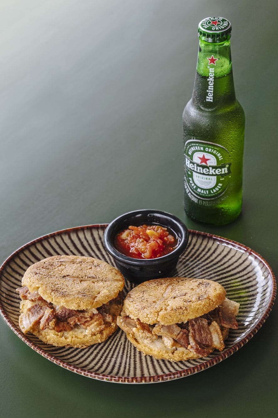 - Arepitas crocantes de chicharrón: Dos delicadas arepas, elaboradas artesanalmente y rellenas de chicharrón dorado en su punto exacto de crocancia. Se sirven acompañadas de un suave guacamole de la casa y un hogao tradicional, reducido a fuego lento para resaltar su sabor.