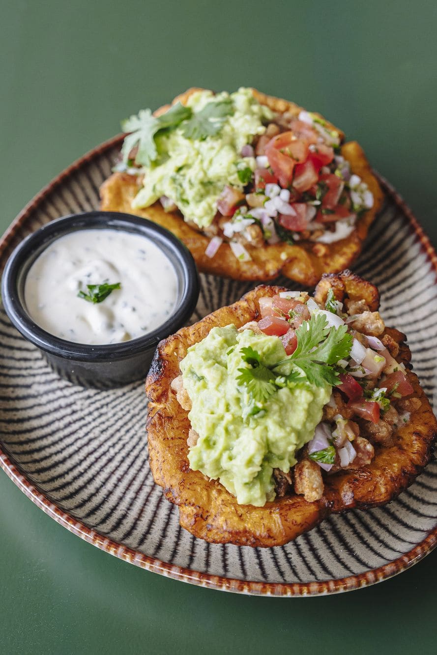- Canasticas de la abuela: Canasticas de plátano rellenas de chicharroncitos crocantes, acompañadas de guacamole fresco y pico de gallo.