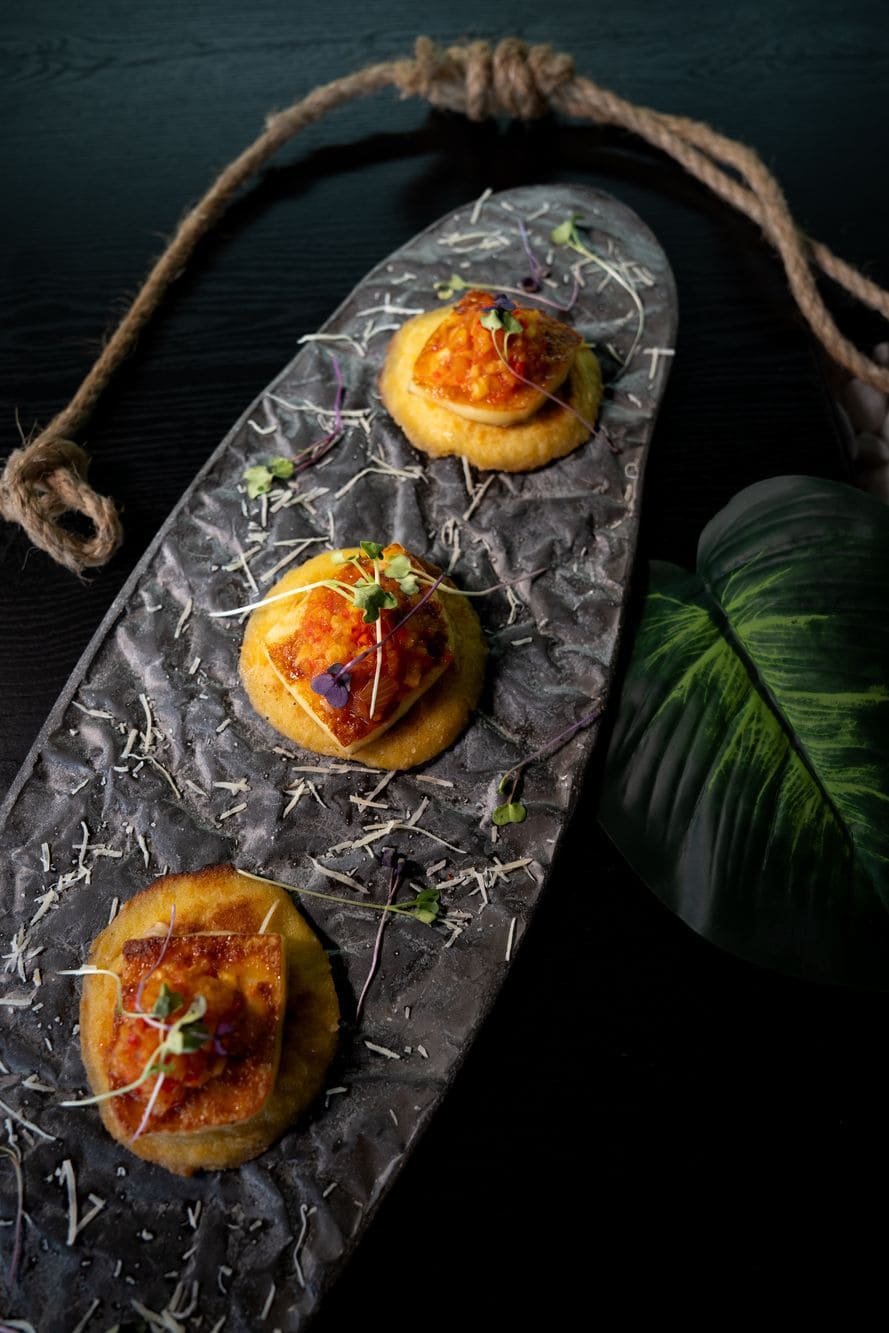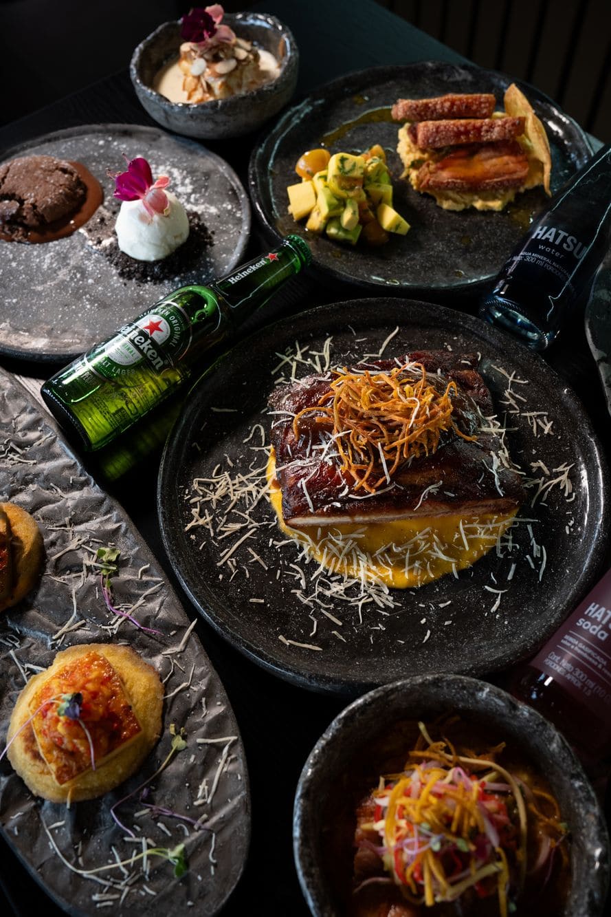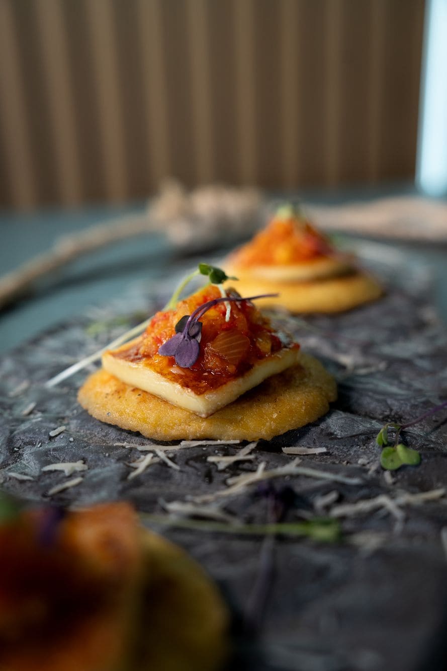 - Mini arepas de chocolo: Arepitas de chocolo doradas con mantequilla, acompañadas de queso papialpa a la brasa y un sutil ají de piña.