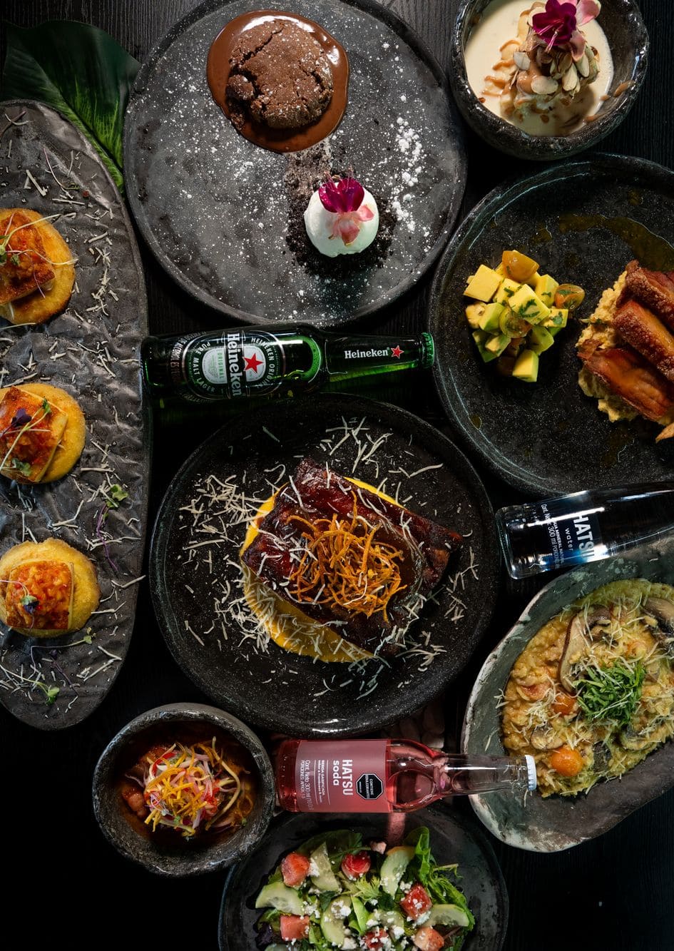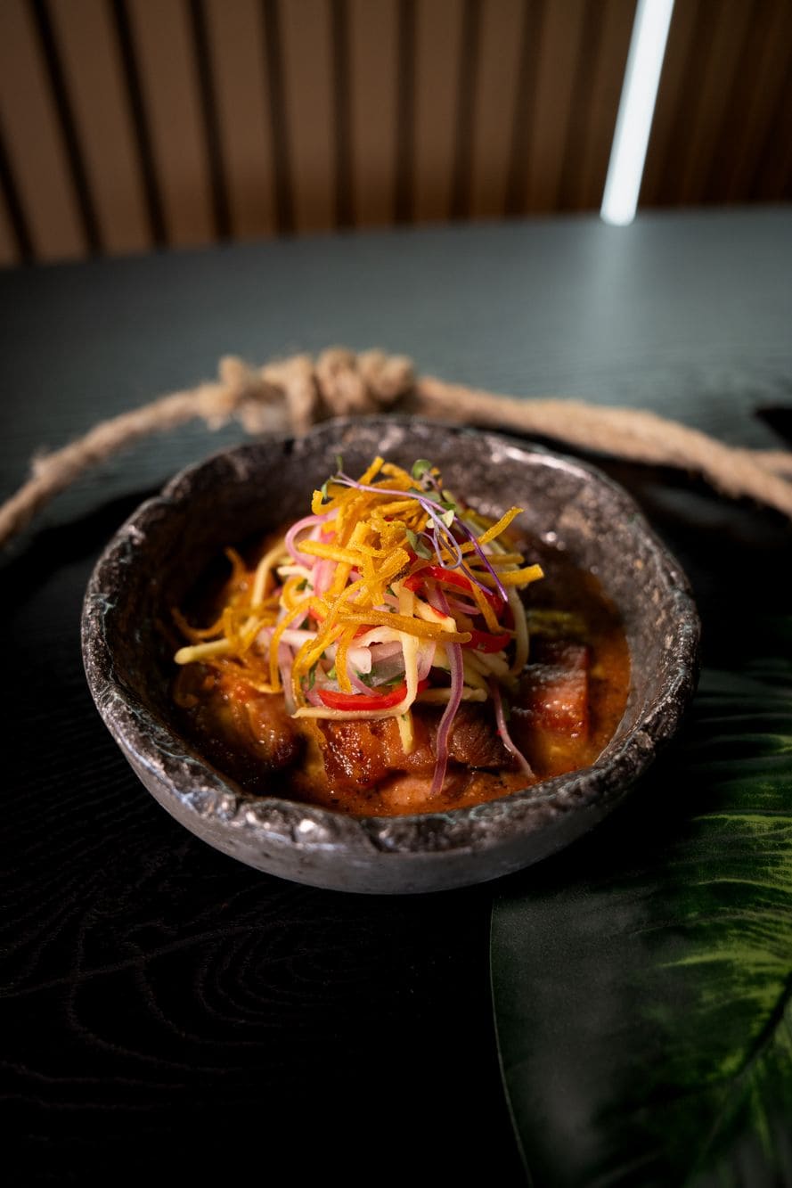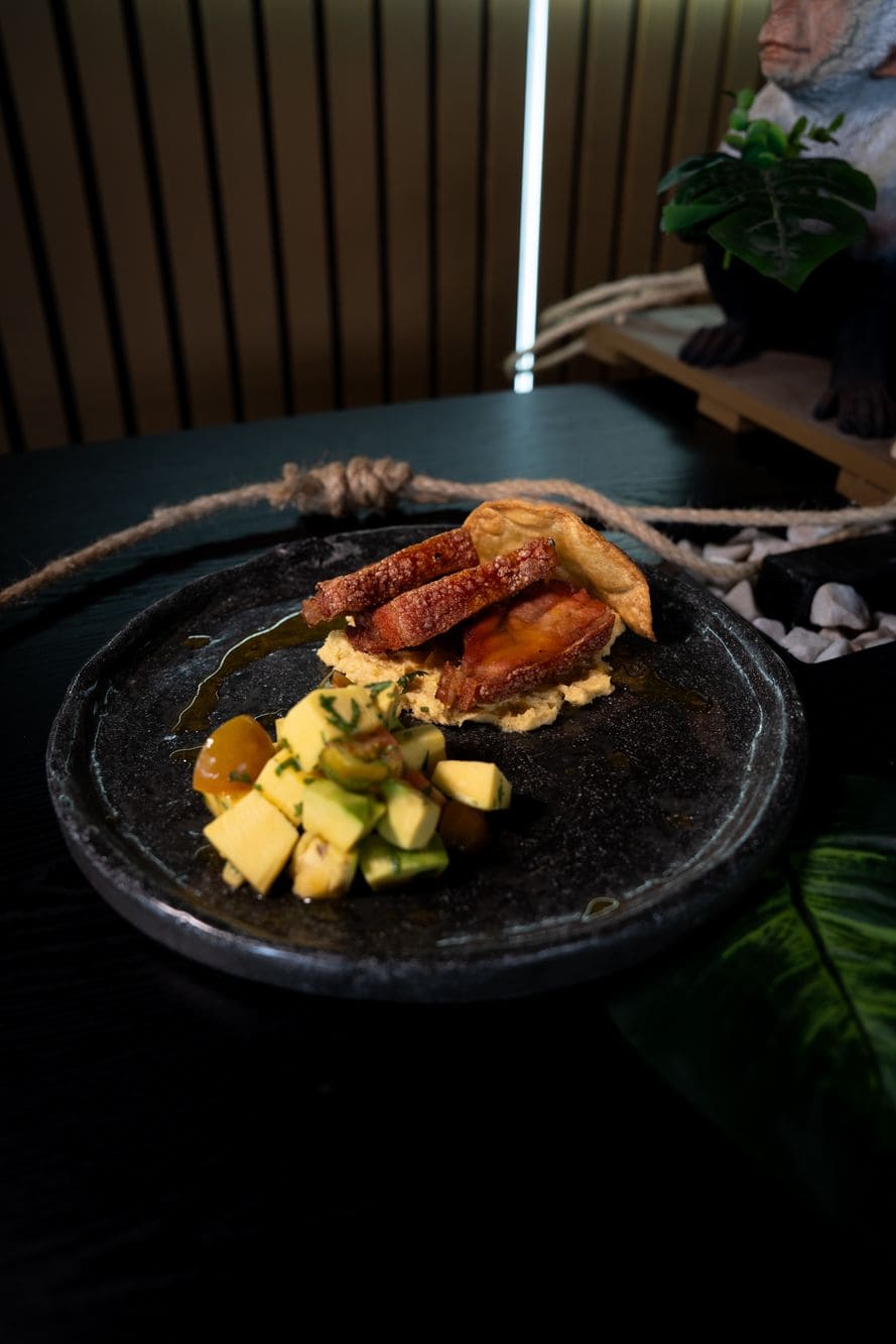 - Ceviche de chicharrón tropical: Crujientes trozos de chicharrón ahumado al barril, servidos sobre guacamole fresco, con un acevichado de mango y leche de tigre de maracuyá, coronados con delicados crocantes de plátano.