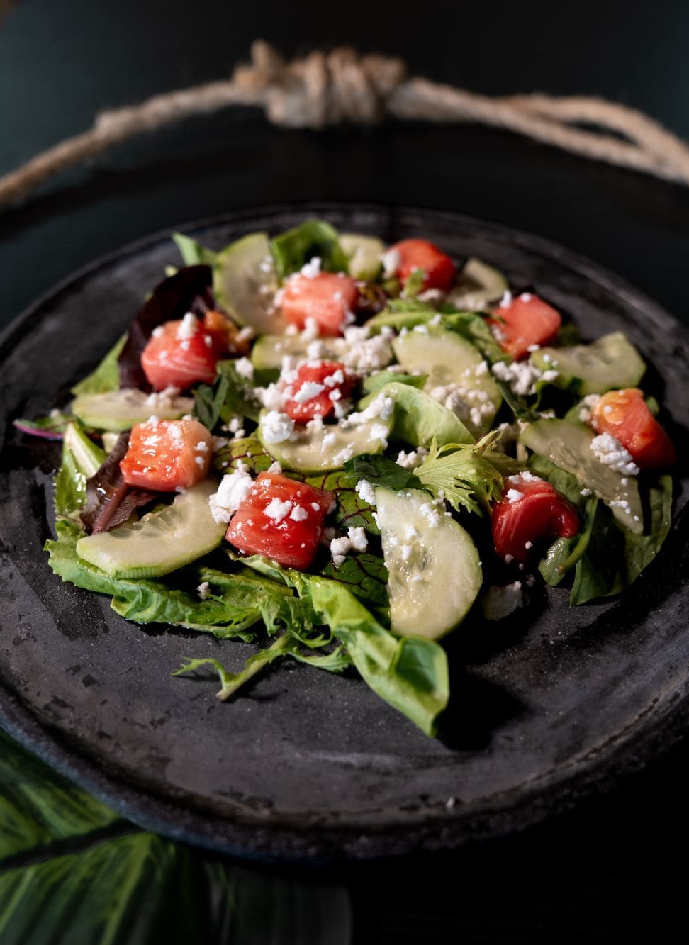 - Ensalada griega de sandía y menta: Mezclum de lechugas frescas con cubos de sandía en ósmosis de azúcar y limón mandarino, julianas de pepino, queso feta, hojas de menta y un delicado toque de miel de limón. (vegetariano)