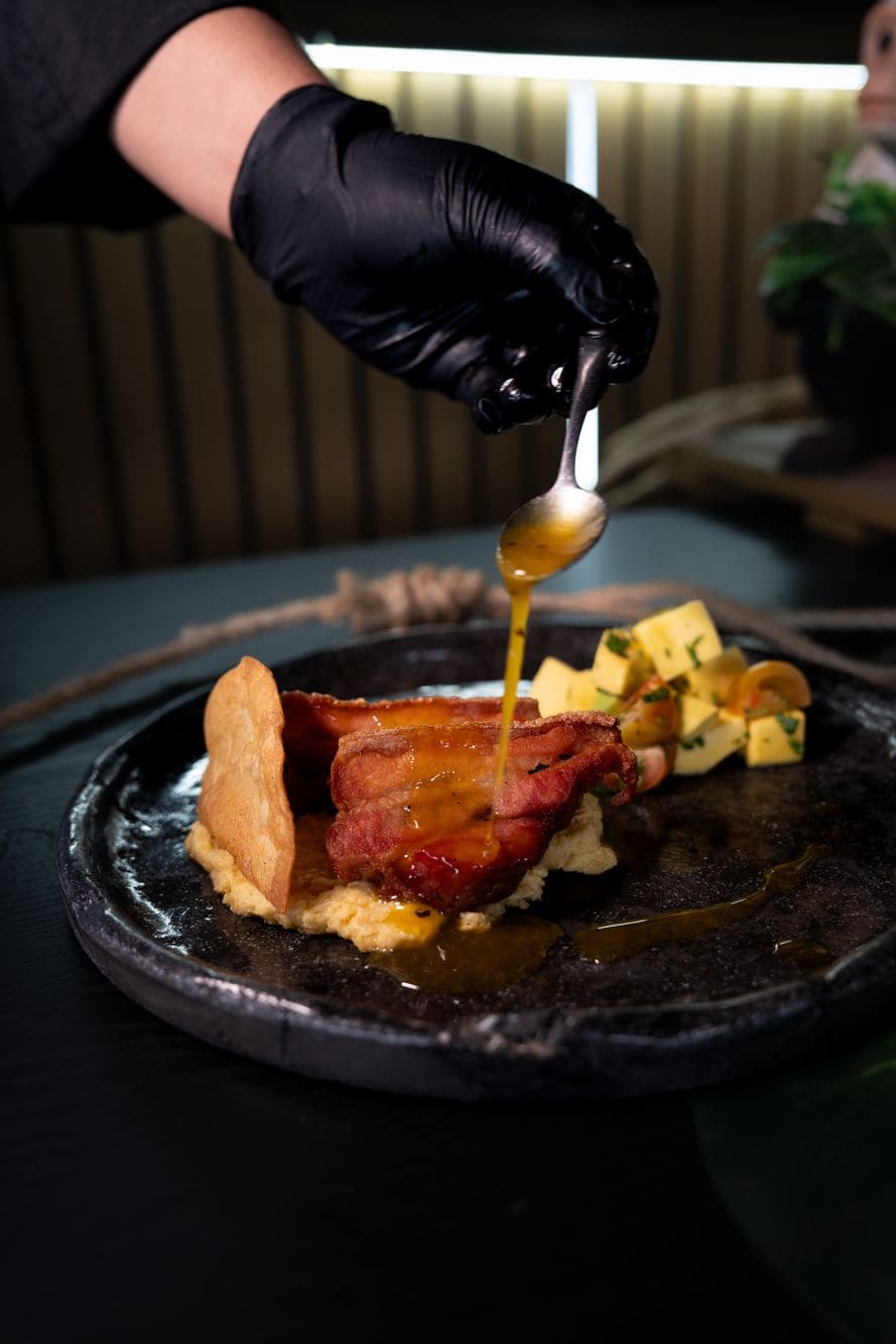 - Armonía paisa: Crujiente chicharrón al barril, servido con suave puré de plátano maduro, acompañado de una ensalada fresca de mango, aguacate y tomates cherry, con toques de crocante de maíz y una delicada reducción de maracuyá que realza cada bocado.