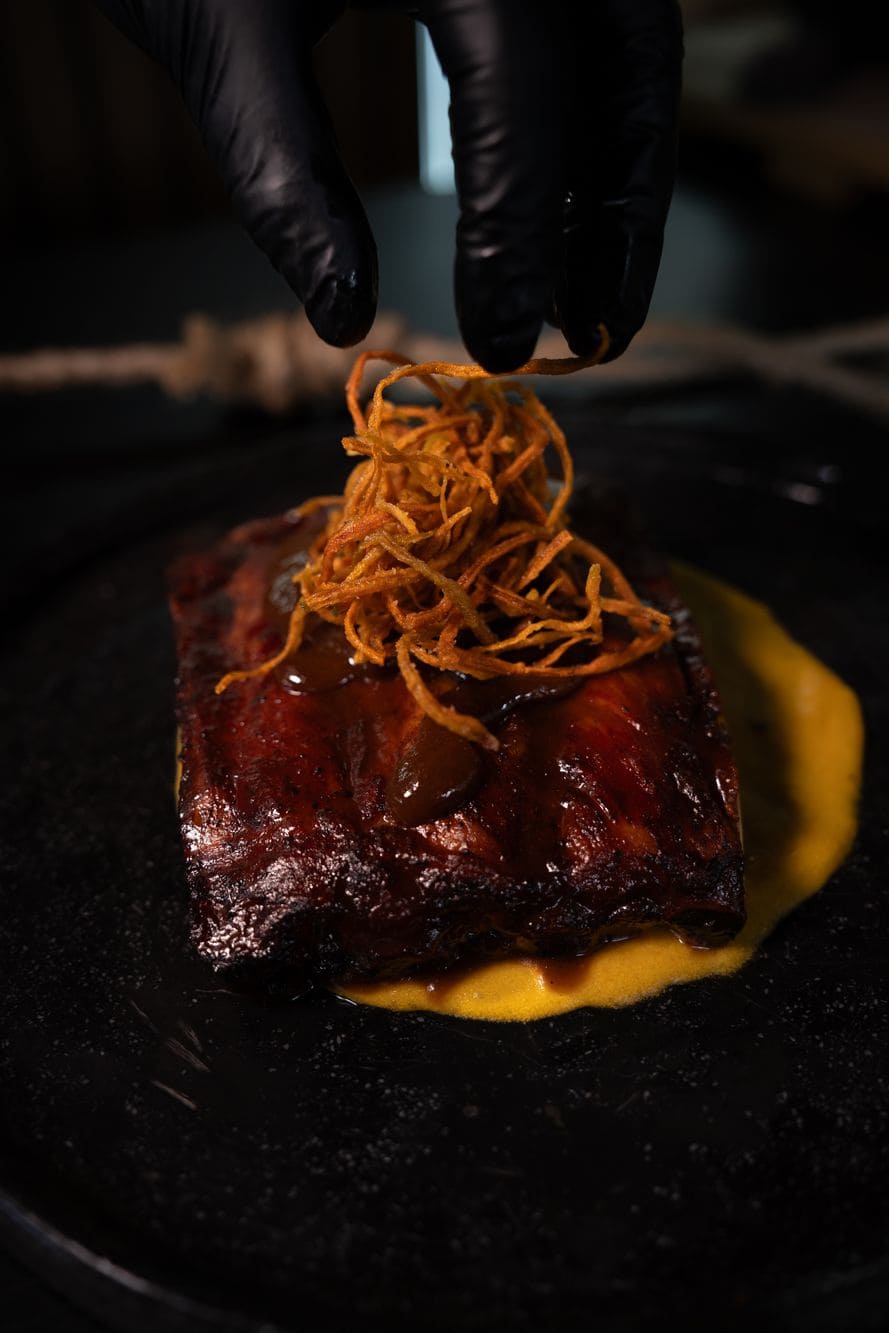 - Wakanda Ribs: Baby rack de costillas St Louis carnudas con 8 horas de ahumado en el barril, bañadas en una salsa de BBQ de tamarindo, sobre una cama de puré de papa criolla y zanahoria, con espiral de zanahoria y un toque de parmesano.