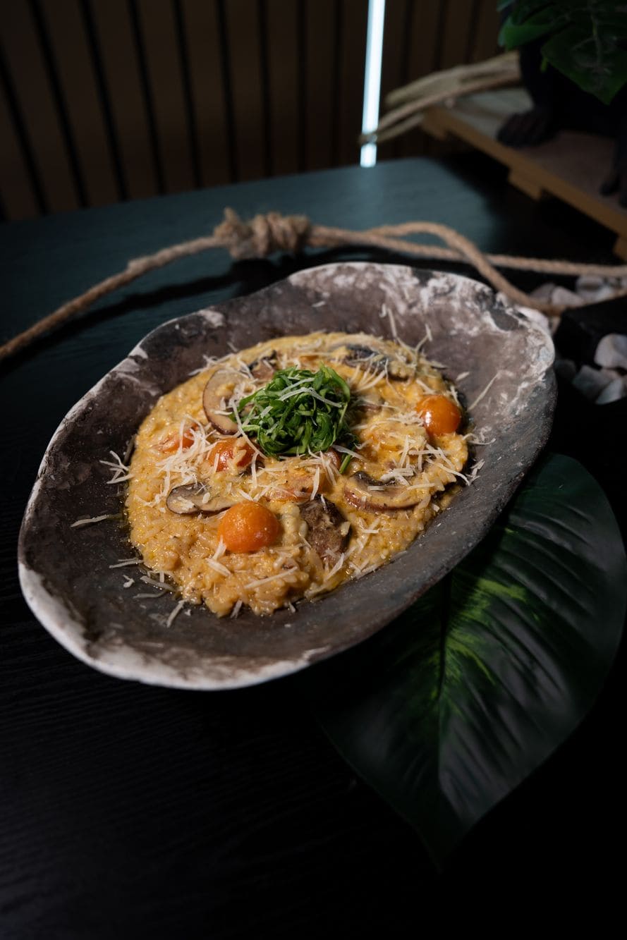 - Risotto de portobellos y tomates cherry: Arroz cremoso infusionado con pimiento amarillo asado, acompañado de portobellos y tomates cherry salteados, terminado con rúgula fresca y lascas de parmesano. (Vegetariano)
